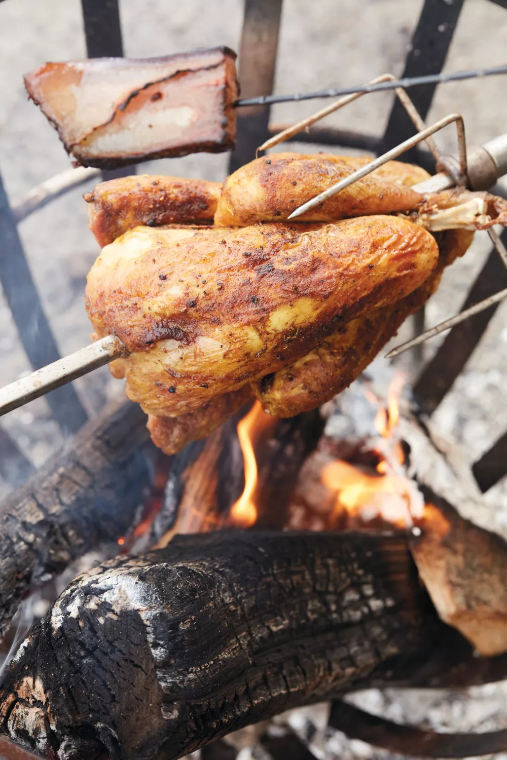 Sappige kip aan het spit met een rokerige, citrusachtige twist: kippen worden gevuld met natuurhooi geweekt in Duvel, limoen, appel en witloof en royaal ingesmeerd met een marinade van gerookt pyramidezout, paprikapoeder en gemalen koffie. Langzaam draaien boven een matig houtvuur zorgt voor knapperig vel en diepe rooksmaak. Perfect voor een feestelijk buitenetentje in zomer of herfst.