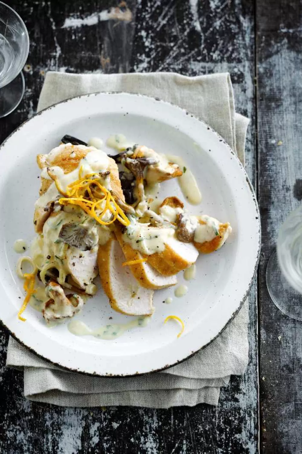 Serveer de kip met de champignonsaus en garneer met zest van sinaasappel. Tip: Lekker met een gepofte aardappel!