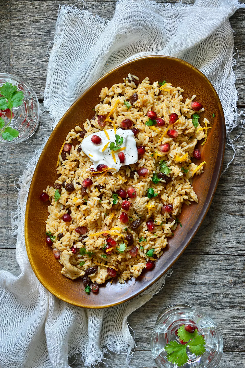 Verdeel de rijstmengeling over een grote schotel en werk af met granaatappel, koriander, sinaasappelzeste en Griekse yoghurt.