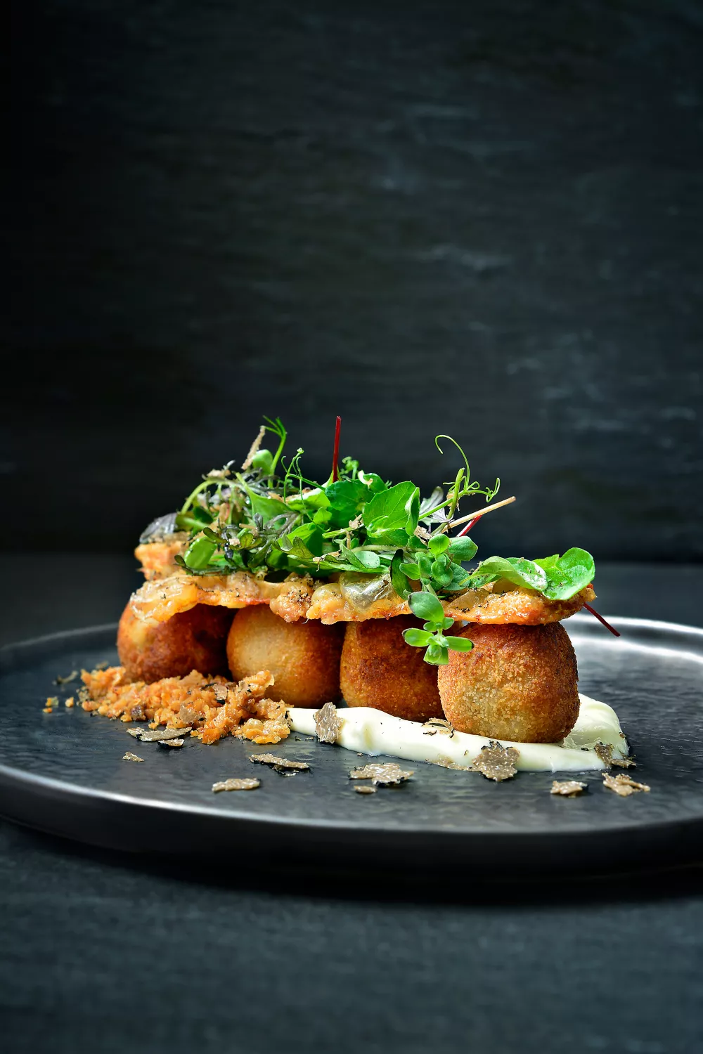 Serveer de kipkroketjes met een kruidenslaatje, de truffelmayonaise, vers geraspte truffel en krokant gebakken vel van kip (leg het vel gedurende 25 minuten tussen twee siliconenmatjes in een voorverwarmde oven van 160 graden).