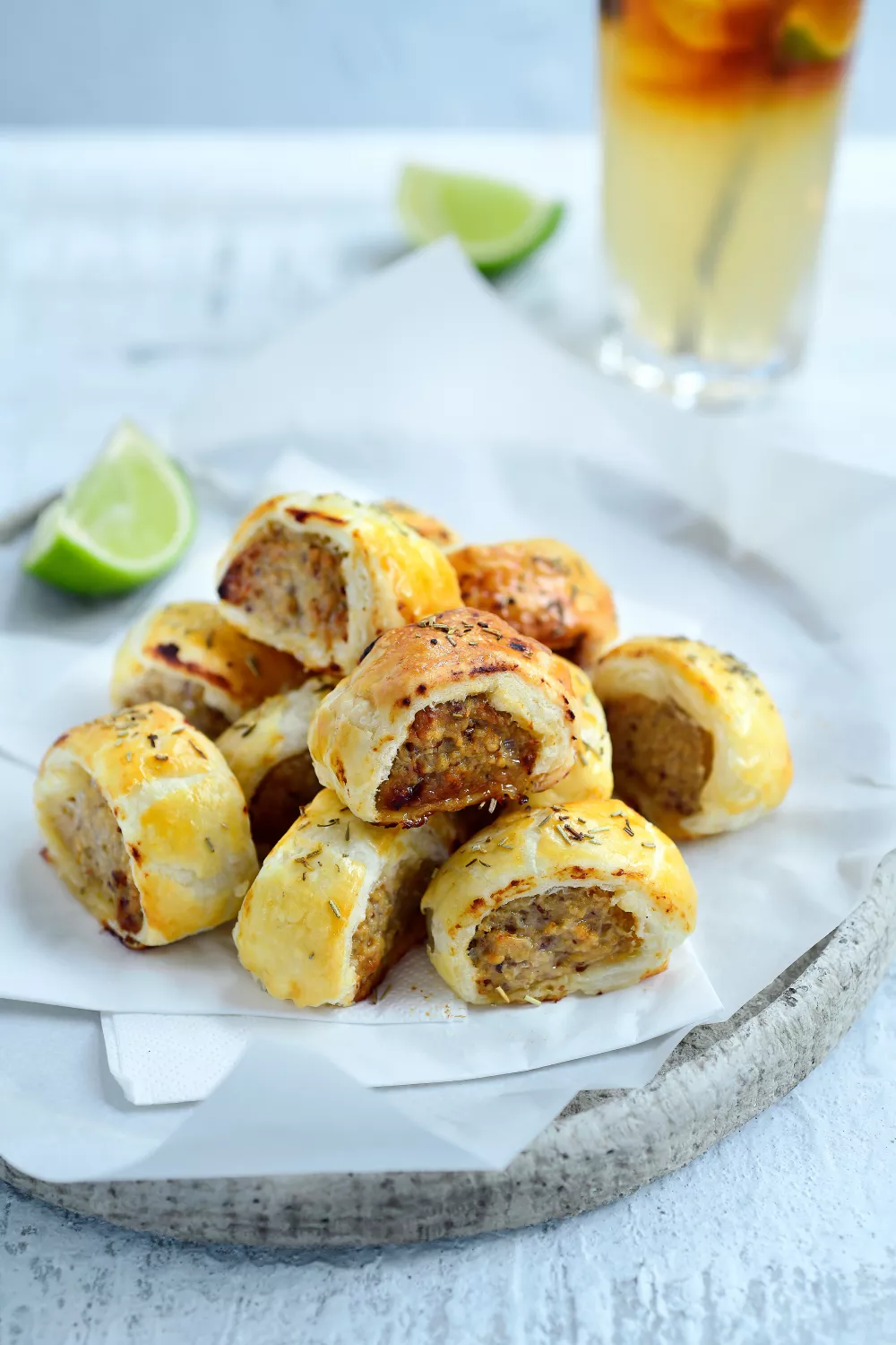 Sappige kippenworstenbroodjes met honing en twee soorten mosterd in knapperig bladerdeeg, een warme zoet en pittige snack die snel op tafel staat. De kippengehaktvulling met tijm en panko wordt opgerold, in porties gesneden en goudbruin in de oven gebakken. Ideaal voor borrel, lunch of picknick, het hele jaar door.