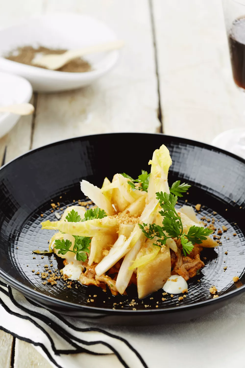 Stappenplan om recept “Knolselder in zoutkorst, grondwitloof en wilde paddenstoelen” te bereiden