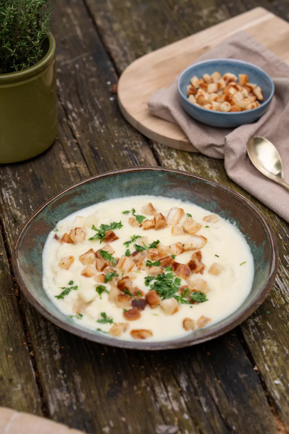 Deze romige knolseldersoep met zachte pladijsreepjes combineert aardse knolselderij en volle room met frisse peterselie en knapperige croutons voor een warm en verfijnd voorgerecht. De groenten worden zacht gestoofd en glad gemixt tot een fluweelzachte basis, de croutons goudbruin gebakken en de dunne pladijsreepjes garen subtiel onder de hete soep. Perfect als herfstig voorgerecht of warme lunch, snel te bereiden en feestelijk genoeg voor een diner.