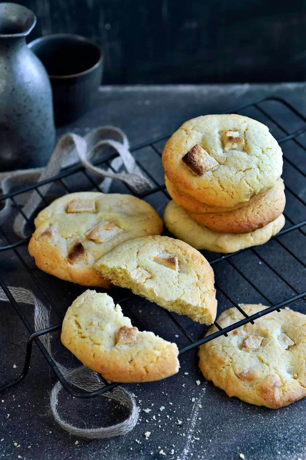 Verwarm de oven voor op 180 graden. Meng de boter met de suiker en het ei tot een gladde massa. Meng er de bloem onder tot je een mooi deeg krijgt. Hak de witte chocolade in blokjes en meng onder het deeg.