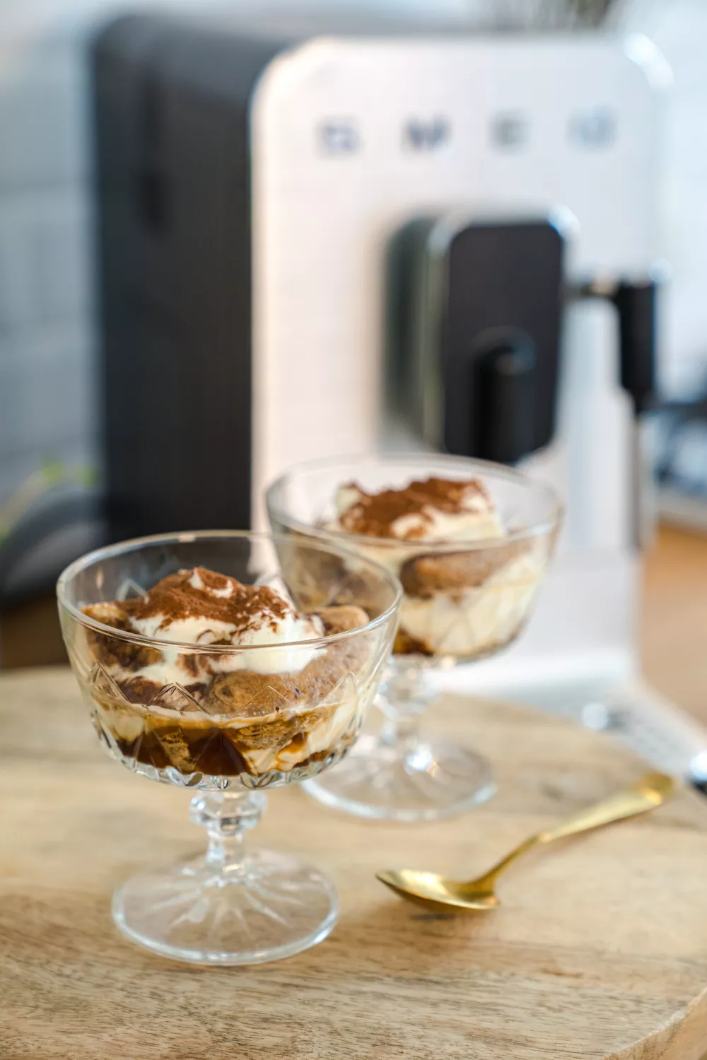Neem glaasjes en leg op de bodem een laagje lange vingers. Verdeel er wat van het mascarponemengsel over. Schik er opnieuw lange vingers op. Zet de glaasjes onder de koffiemachine en laat er een espresso over lopen. Dek af met nog een extra laagje mascarponecrème. Werk de glaasjes af met een laagje cacaopoeder.