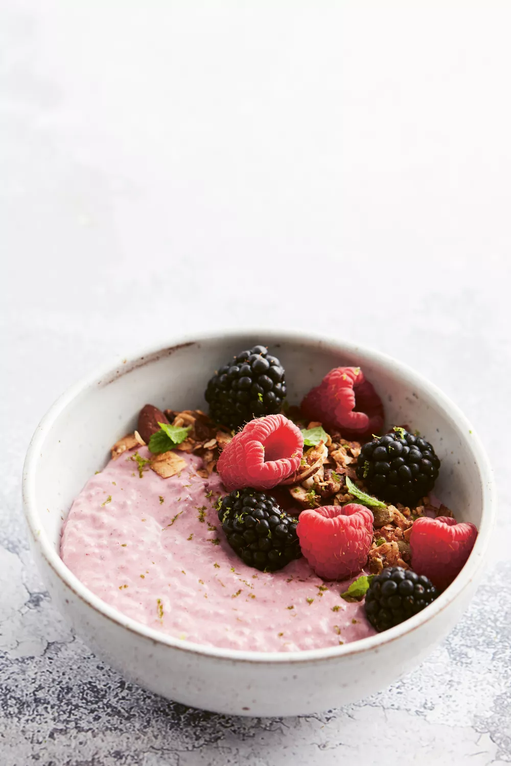 Serveer met hennepzaad, verse bessen, enkele lepels granola of een handvol gemengde noten en pitten.