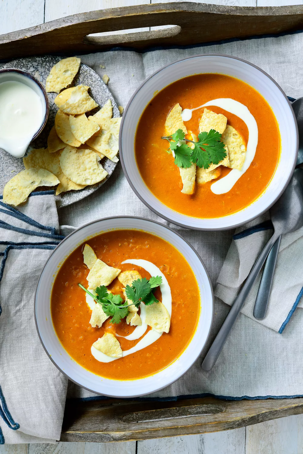 Romige kokosdahlsoep met rode linzen en een warme mix van komijn, koriander, curry en kurkuma brengt een Indiase twist aan je avondmaaltijd. De soep maak je snel in één pan door de specerijen kort te fruiten en vervolgens te laten sudderen in kokosmelk en groentebouillon tot de linzen zacht zijn. Serveer met krokante papadumcrackers en verse koriander voor een troostrijke, vegetarische soepspecialiteit ideaal voor doordeweekse diners of herfstige avonden.