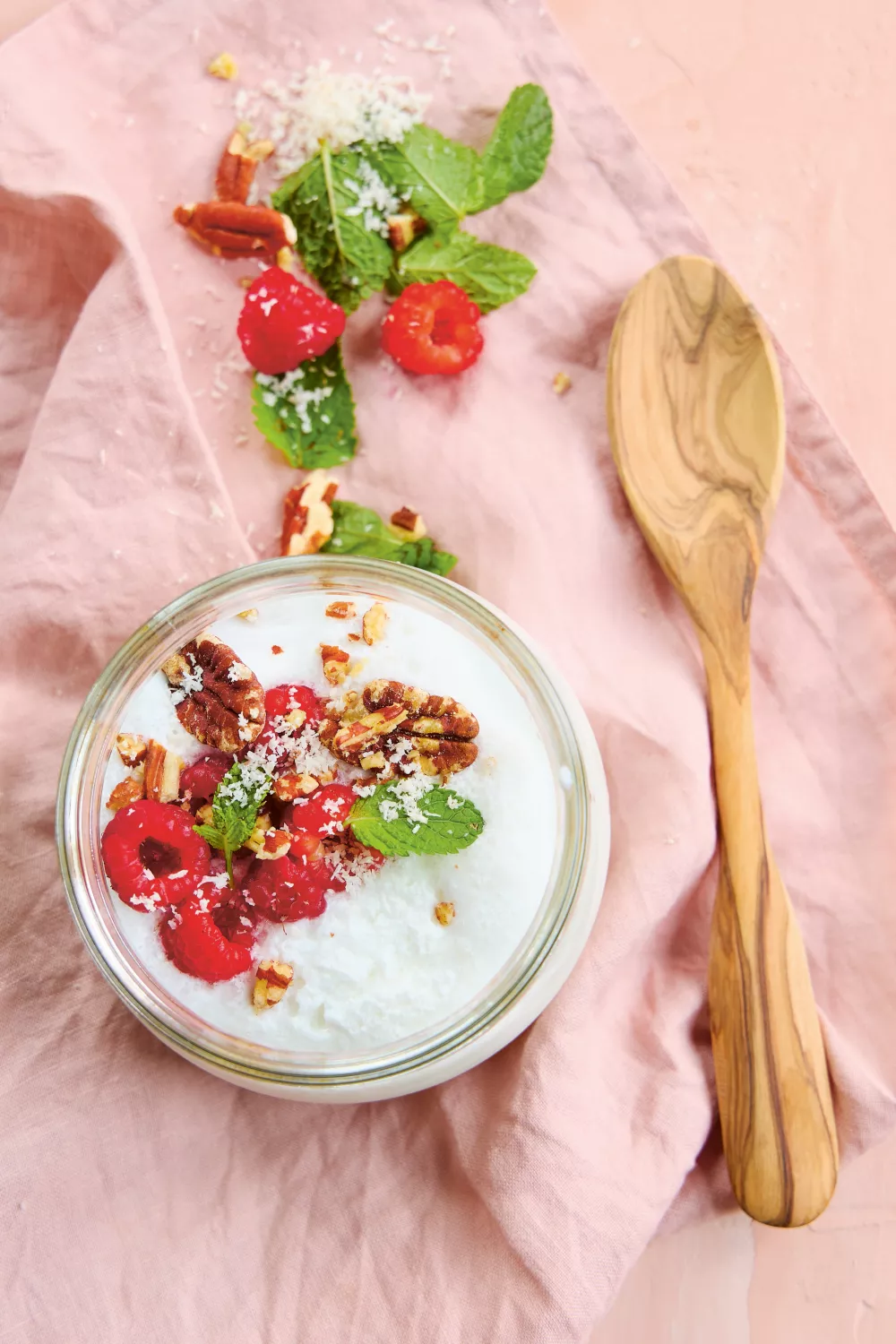Garneer de yoghurt met frambozen, pecannoten, kokosrasp en muntblaadjes. De kokosyoghurt blijft maximaal 4-5 dagen goed in de koelkast. Wil je een steviger resultaat, laat het dan met lijnzaad, chiazaad of havervlokken overnachten in de koelkast.
