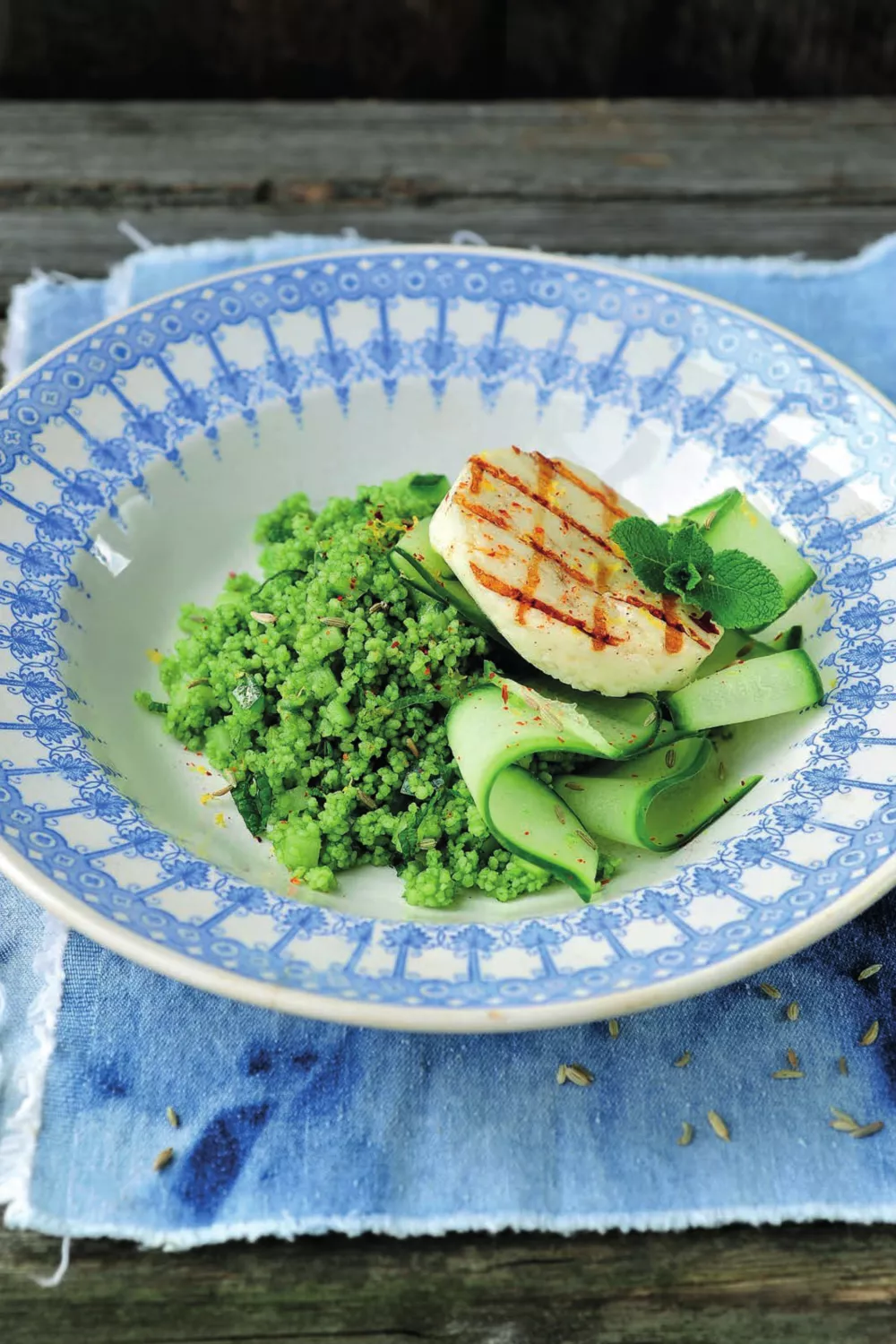 Komkommercouscous met gegrilde halloumi op ‘n spiesje