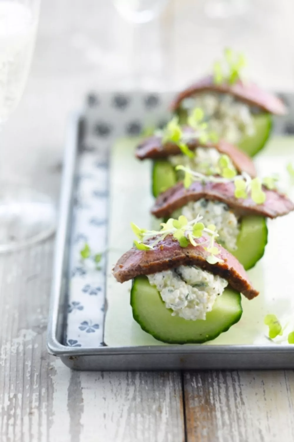 Lichte, frisse komkommerhapjes met malse lamsfilet, romige feta, munt en zachte couscous vormen een uitnodigend zomers voorgerecht of borrelhap. Het snel aangebakken lamsvlees met een gekoelde komkommerbasis zorgt voor een fijn contrast in textuur en smaak. Ideaal voor een informele lunch, tapasplank of buitense maaltijd.