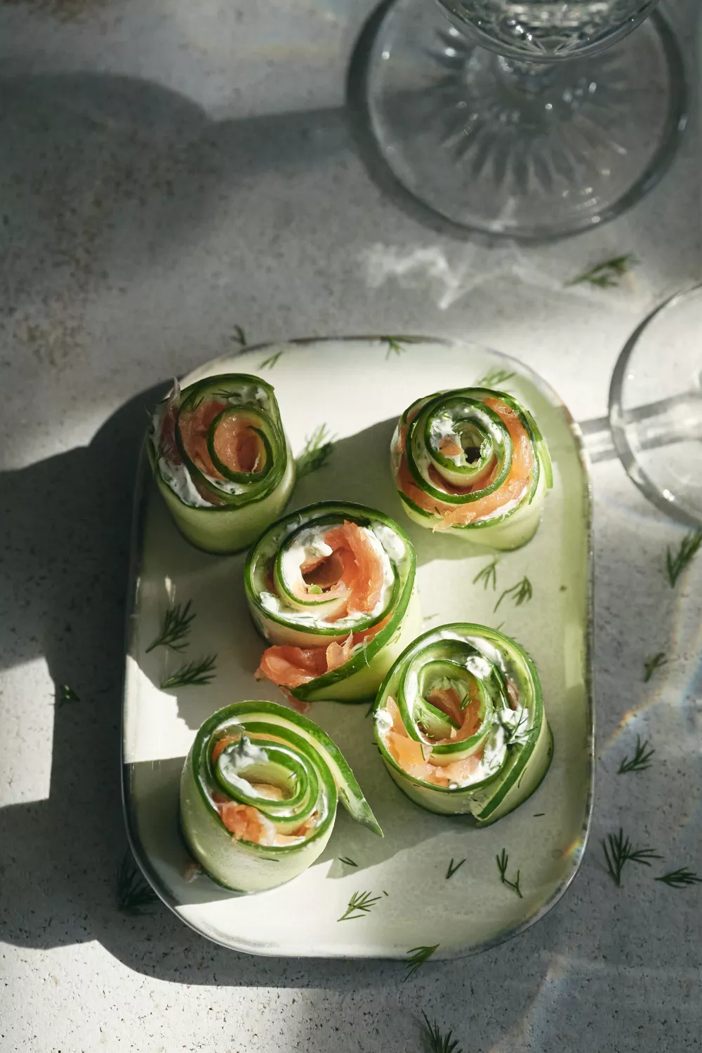 Frisse komkommerrolletjes met romige kruidenmascarpone en gerookte zalm zijn perfecte lichte hapjes voor een zomerse borrel of feestelijk aperitief. Dille en citroen geven elk rolletje een frisse, ziltige toets en zorgen voor balans met de mascarpone. Het schaaf- en rolwerk is eenvoudig en staat snel op tafel.