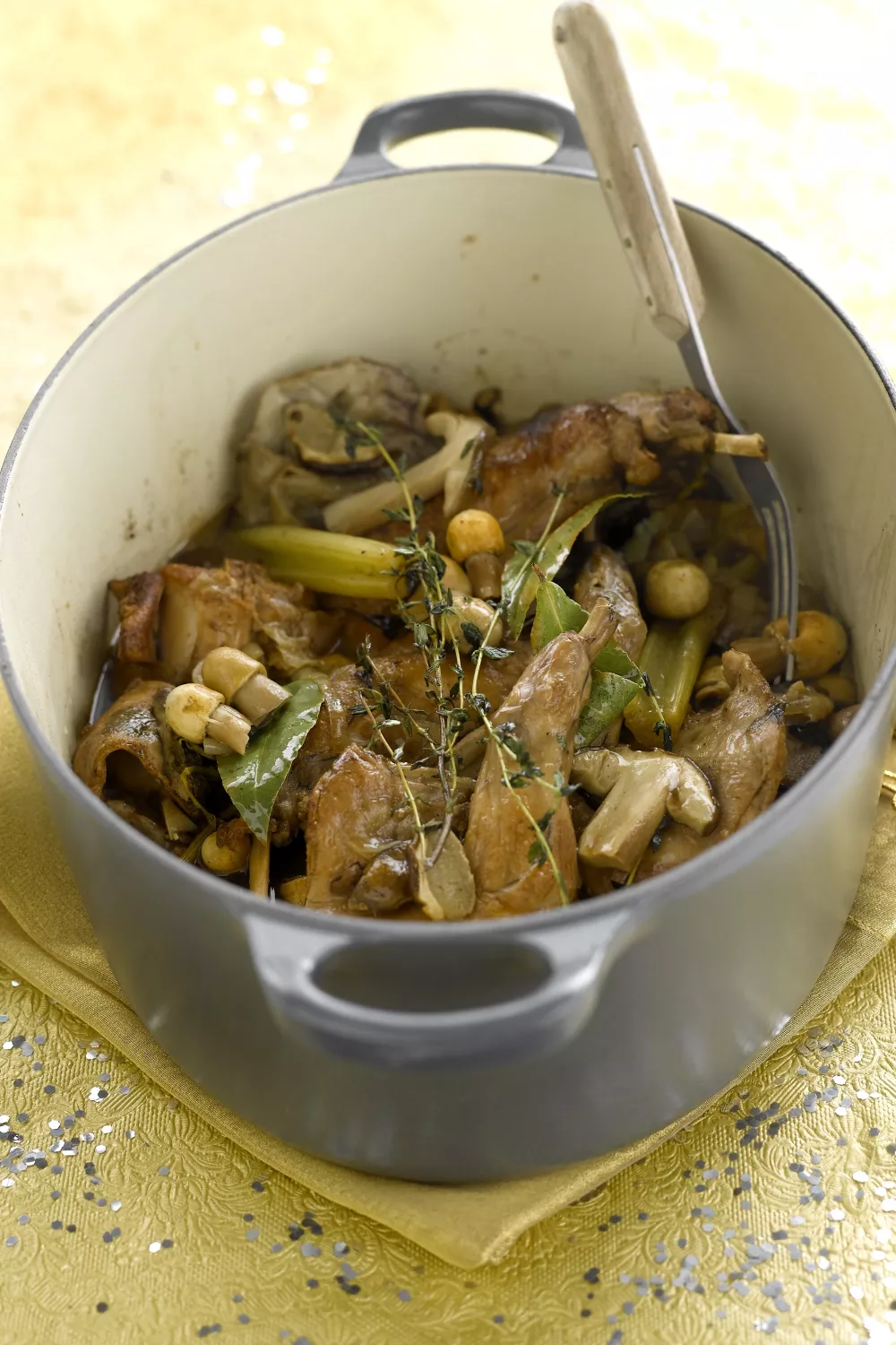 Een zachte herfstige stoofschotel van konijn en bospaddenstoelen, rijk aan aardse aroma's van tijm, jeneverbessen en gebraden uien. Het konijn wordt eerst aangebraden en daarna langzaam gegaard in blond bier en ciderazijn, waarna de saus met mosterd wordt opgedikt tot een volle jus. Bestrooi met verse bieslook en serveer met gekookte aardappelen voor een warm en gezellig hoofdgerecht op koele avonden.