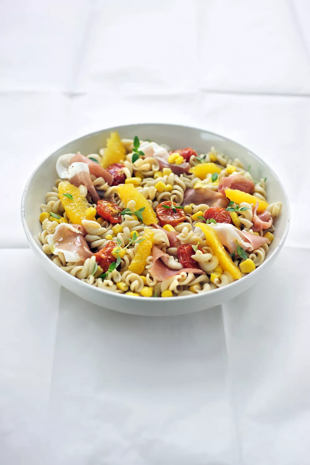 Deze koude pastasalade combineert volkoren spirelli met sappige gegrilde perziken, geroosterde kerstomaatjes, krokante parmaham en zoete maïs voor een zomerse smaakexplosie. Kruidige rozemarijn en tijm en een strooi pecorino geven een mediterraan accent, terwijl het langzaam roosteren van de tomaatjes en kort aanbakken van de perziken extra diepte en geur toevoegen. Perfect als lichte lunch, picknickgerecht of bijgerecht bij de barbecue.