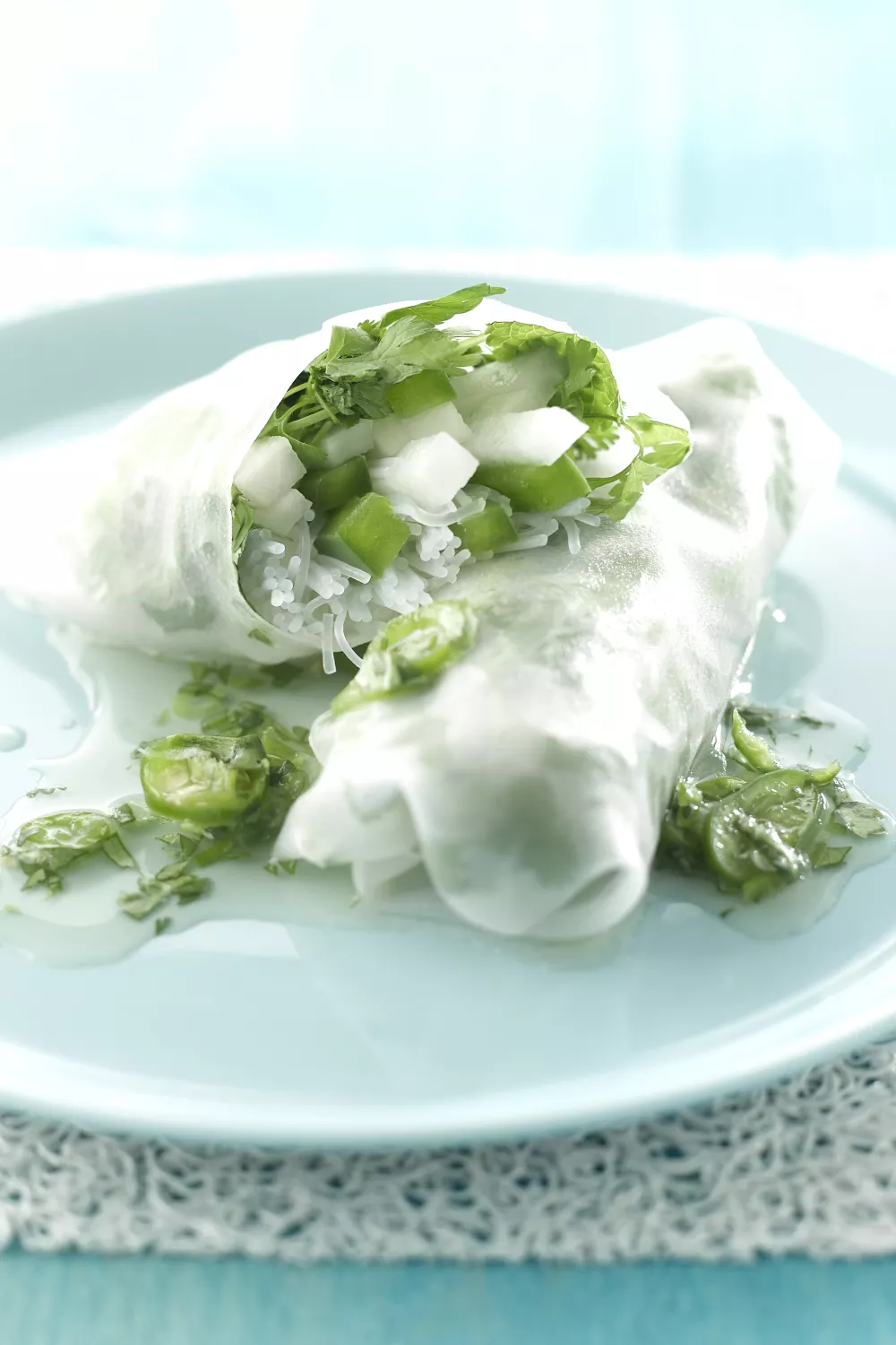 Deze koude rijstloempia's met koriander zijn een frisse, Aziatisch geïnspireerde vegetarische snack vol knapperige paprika, koolrabi en komkommer, zachte glasnoedels en aromatische munt en koriander in een zoetzure rijstazijnmarinade. Het marineren van de groenten, het wellen van de noedels en het oprollen van de rijstvellen is snel gedaan, ideaal voor een lichte zomerse lunch, borrel of picknick. Serveer met een pittige chili-dipsaus voor extra smaak.