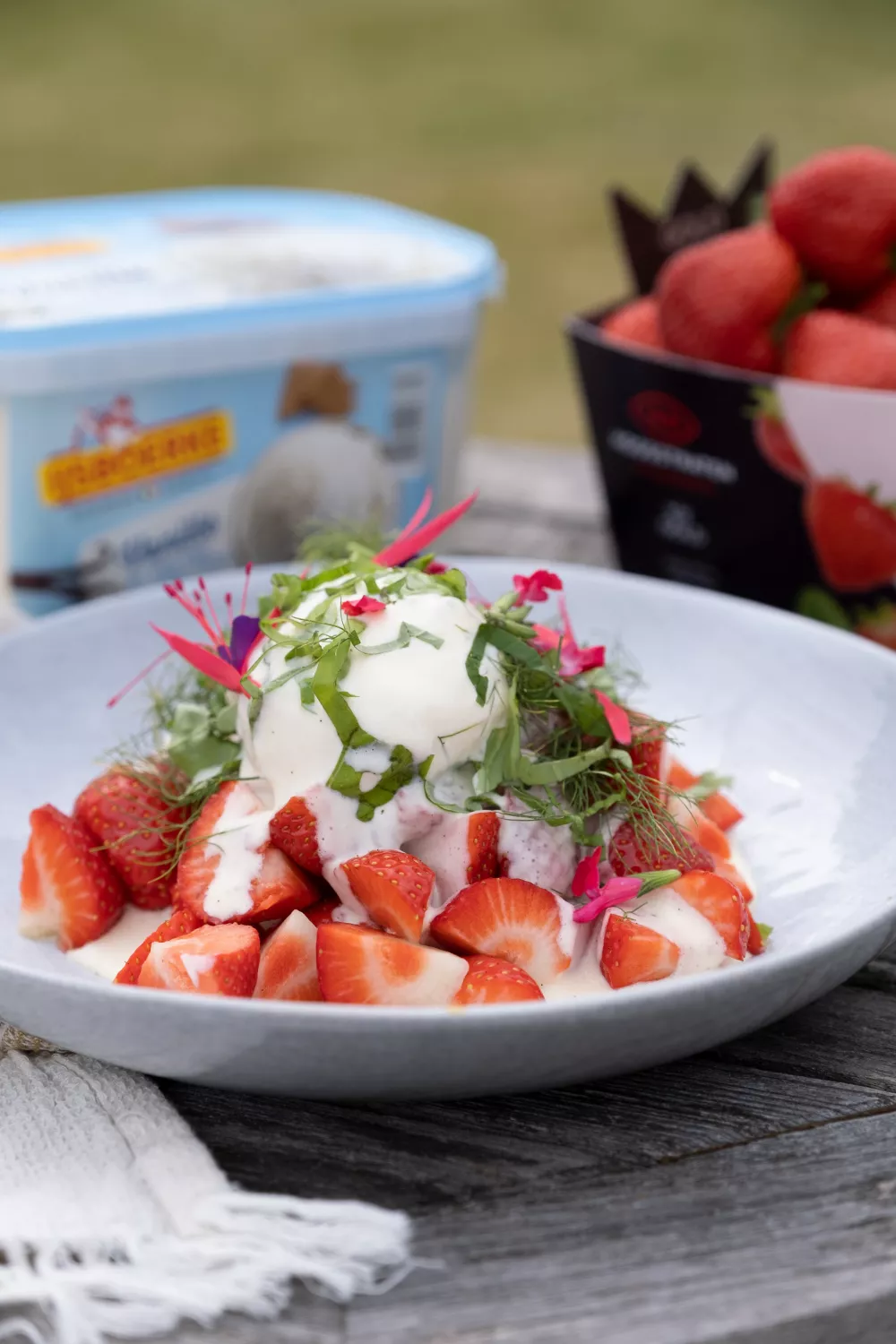 Zomerse koude sabayon met sappige Hoogstraten aardbeien en romig vanille-ijs is een elegant nagerecht voor warme avonden en feestelijke diners. De dessertwijn en eidooiers worden al roerend op het vuur opgeklopt tot 85°C en daarna luchtig gemengd met vanilleroom en slagroom. Werk af met frisse venkelblaadjes voor een aromatische toets.