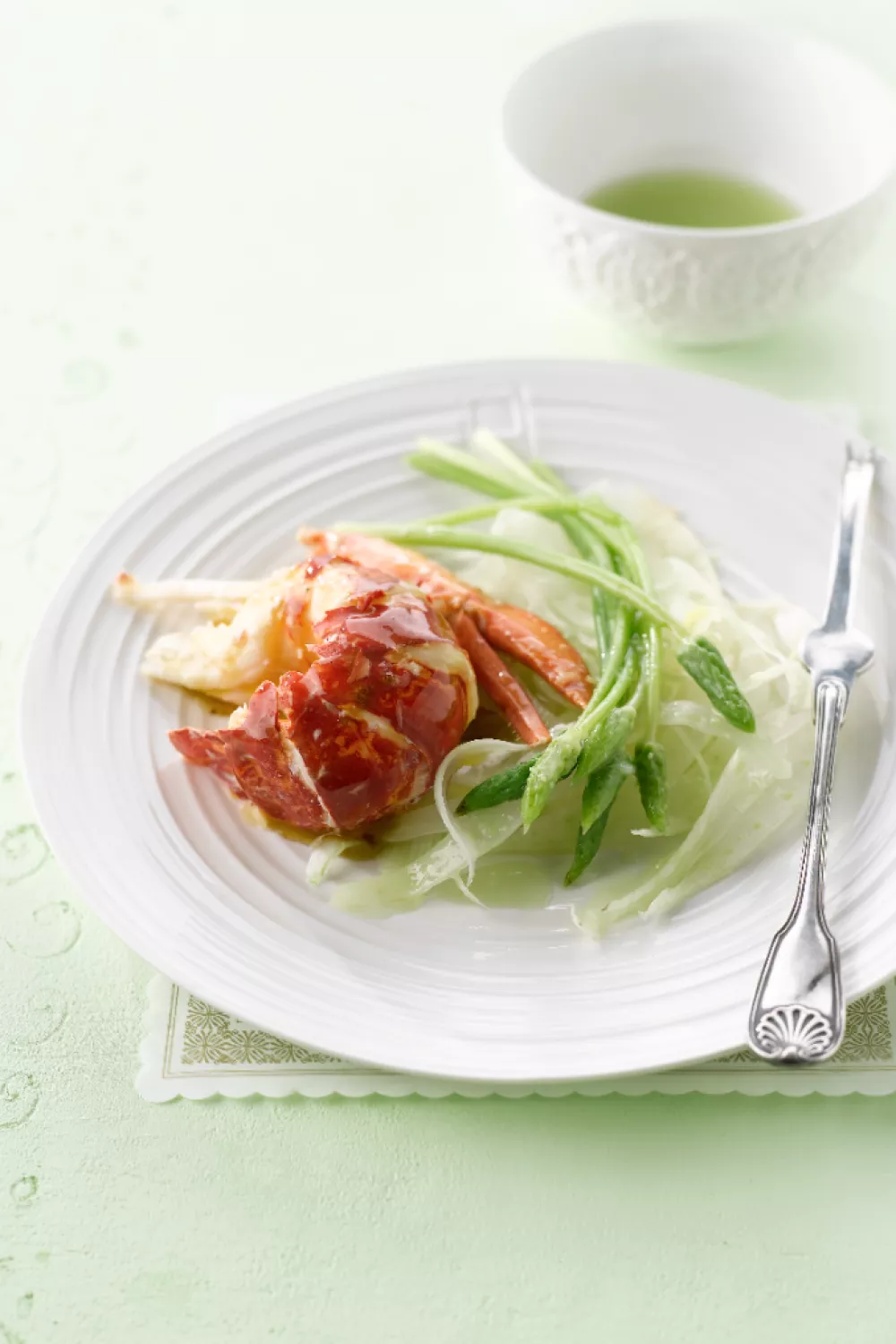 Zacht kreeftenvlees krijgt extra finesse door kort pocheren in een aromatische wijnbouillon en een fluweelachtige Pernodboter, perfect voor een feestelijk diner of zomerse lunch. Het venkelslaatje met geblancheerde mini asperges en een pittige dressing van wasabi, limoen en gember zorgt voor frisse knapperigheid en een lichte anijstoon. Pocheren, blanchen en luchtig kloppen van de boter houden de bereiding eenvoudig maar stijlvol.