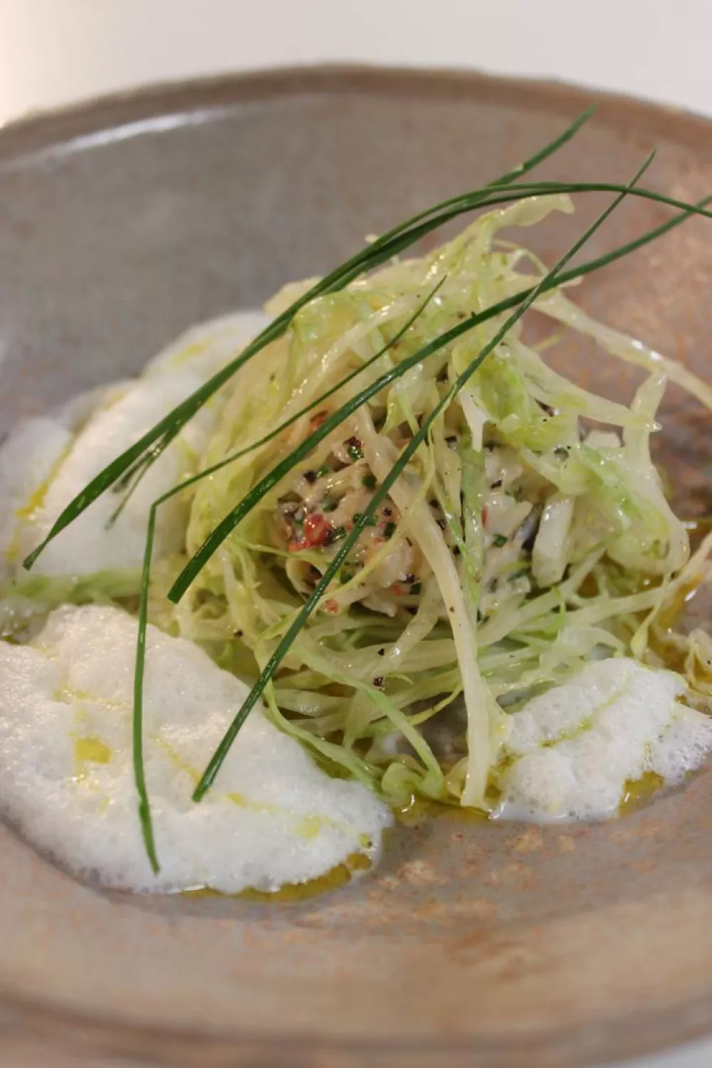 Deze verfijnde kreeftensalade combineert zoet kreeftenvlees met een frisse karnemelkdressing en pittige mierikswortel voor een licht zomers voorgerecht. Knapperige ijsbergsla, rode shiso en lente-ui geven textuur en frisse tonen, terwijl langzaam geïnfuseerde kreeftenolie en een zachte quenelle van mayonaise en kreeft het gerecht een gastronomische touch geven. Perfect als elegant voorgerecht bij een lunch in het voorjaar of de zomer of bij een feestelijk diner, bereid met technieken als zacht verwarmen, blenden en zeven voor subtiele aroma's.