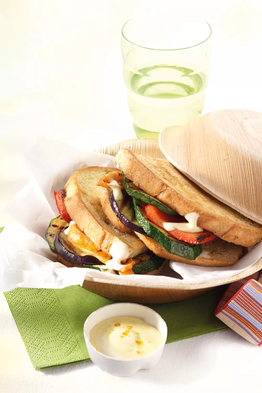 Meng alle ingrediënten voor de dressing. Beleg het brood met de mix van gegrilde groenten en doe er een lepel dressing over. Steek een stokje door het brood opdat alles bij elkaar blijft.
