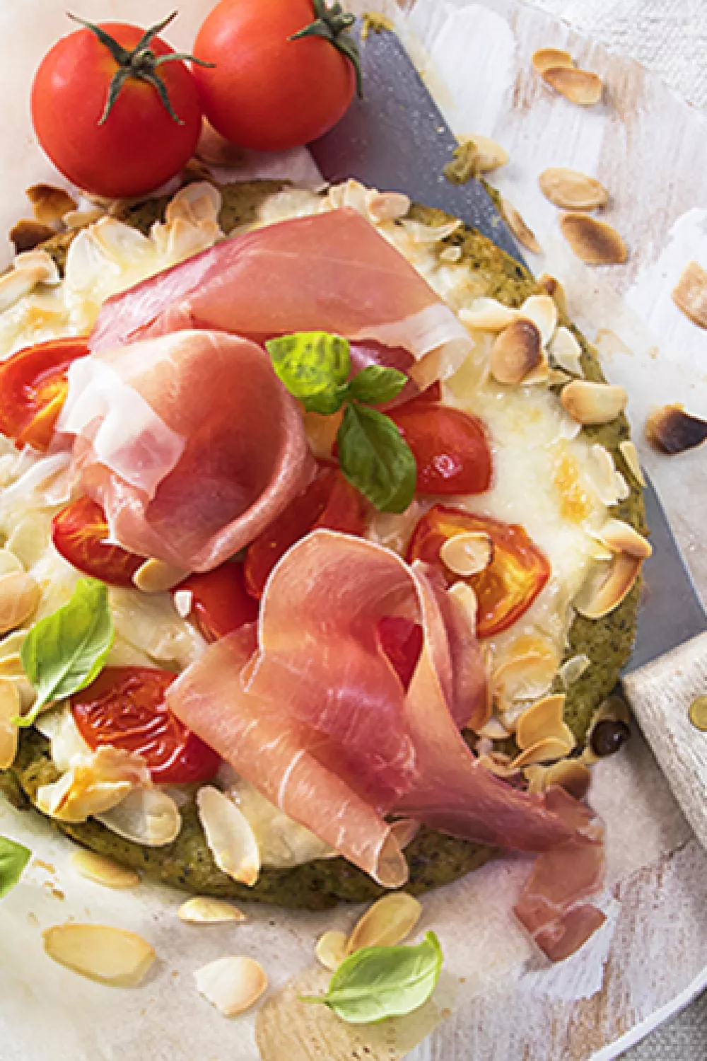 Vet de bovenkant van de pizza een beetje in en bak op 190° C gedurende 20 minuten. Wanneer de pizzabodem gebakken is, versier dan meteen met de toppings: de mozzarella in blokjes gesneden, de kerstomaten in twee gesneden en de amandelschilfers. Zet vervolgens terug in de oven tot de mozzarella gesmolten is. Werk vervolgens af met de sneetjes Parmaham.