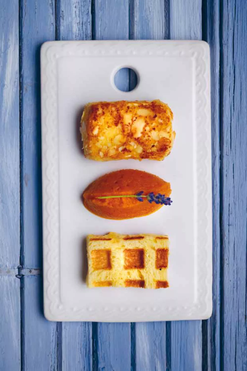 Kroket van brie, confituur van wortel en sinaasappel, wafel van briochebrood