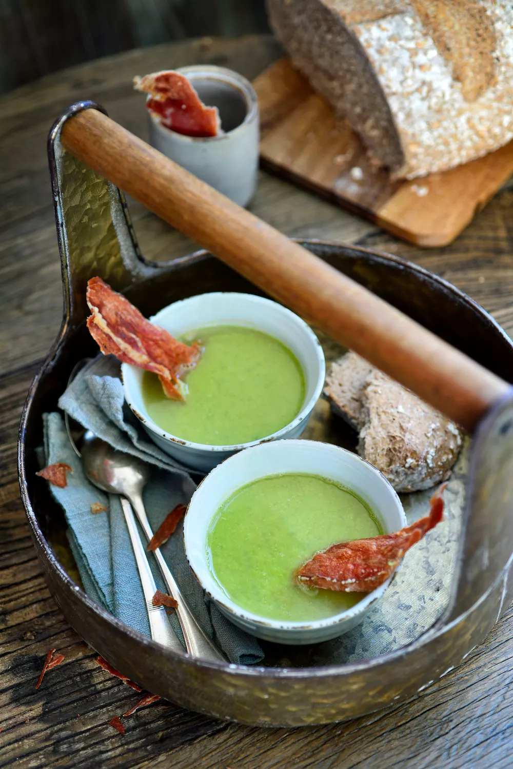 Stappenplan om recept “Kruidige doperwtensoep met chips van ham” te bereiden
