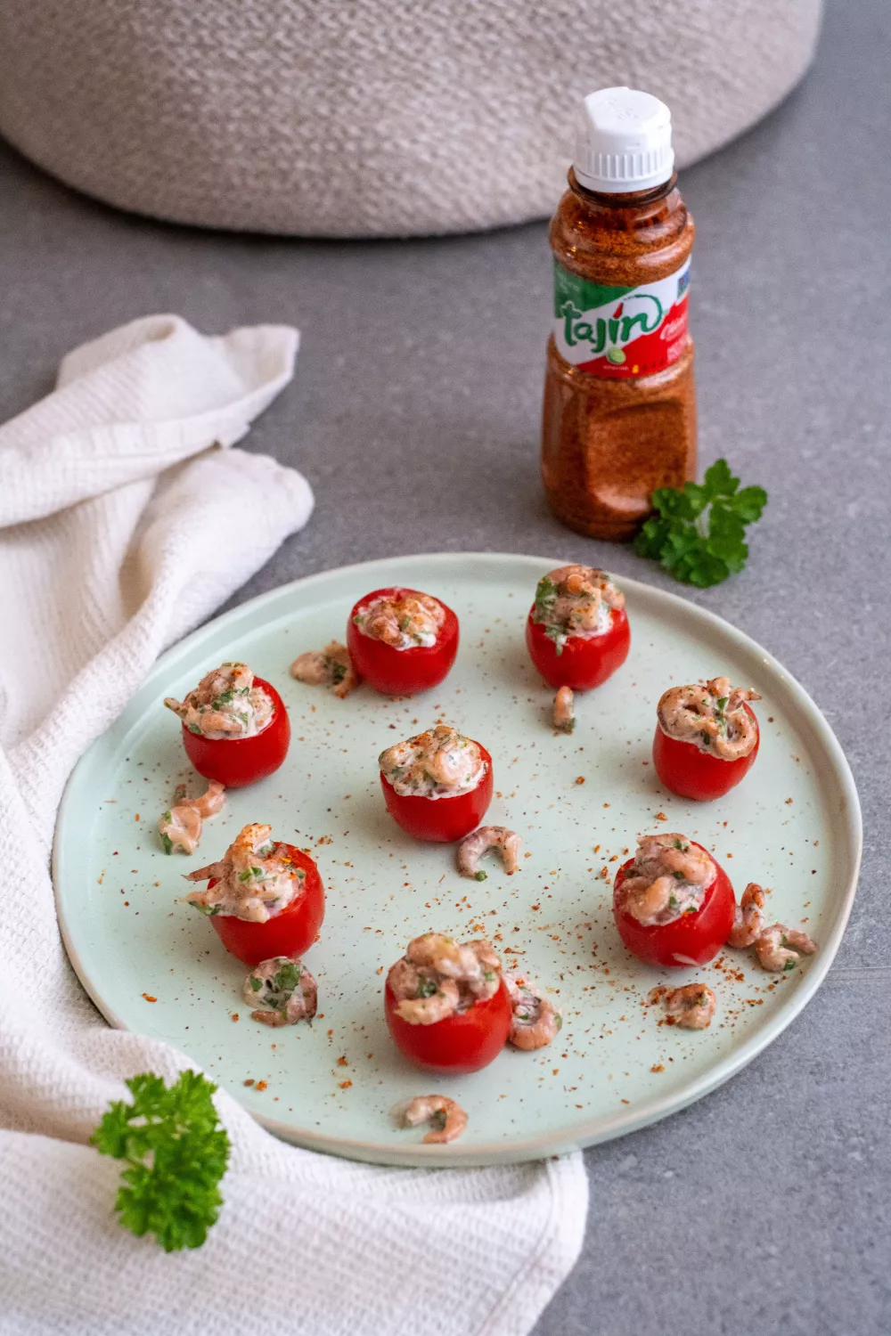 Meng de garnalen met de mayonaise de Tajin kruiden en de fijngehakte peterselie. Vul hier de uitgeholde tomaatjes mee op.