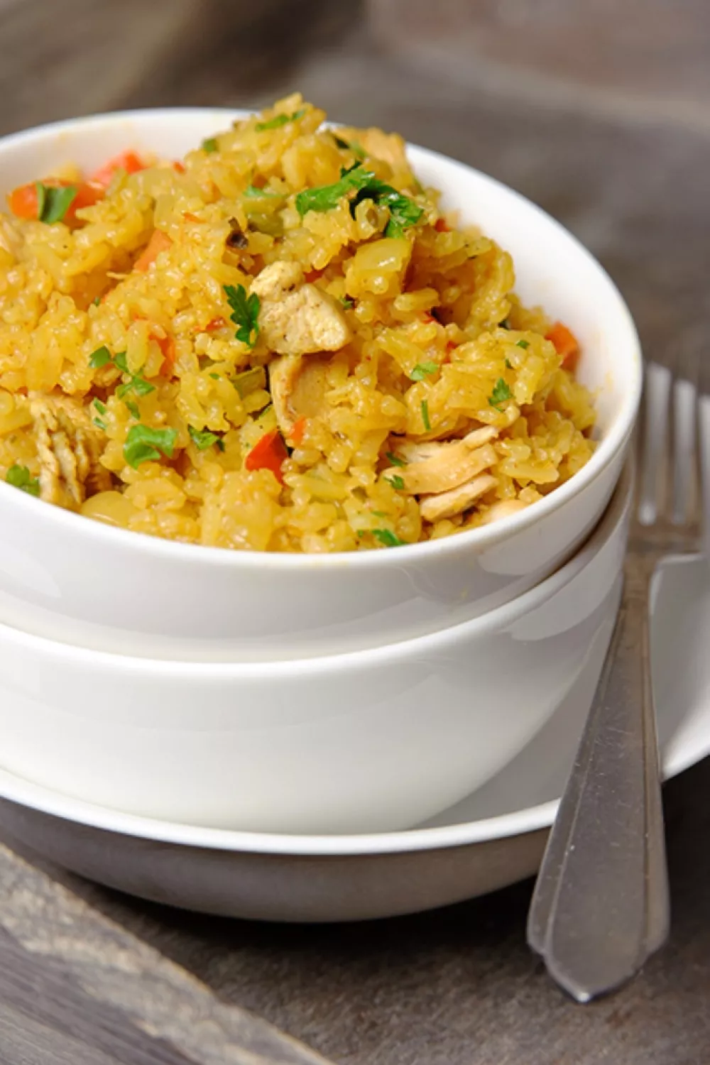 Een geurige eenpansrijst met kip, tomaat en paprika, vol warme specerijen als kurkuma, komijn en paprikapoeder. De rijst kookt in smaakvolle kippenbouillon zodat elke hap zacht en sappig is, ideaal voor een snelle doordeweekse maaltijd of een gezellig familiediner. Met een vleugje cayenne en oregano is dit makkelijke, hartige gerecht perfect voor herfstige avonden maar ook geschikt voor zomerse buffetten.