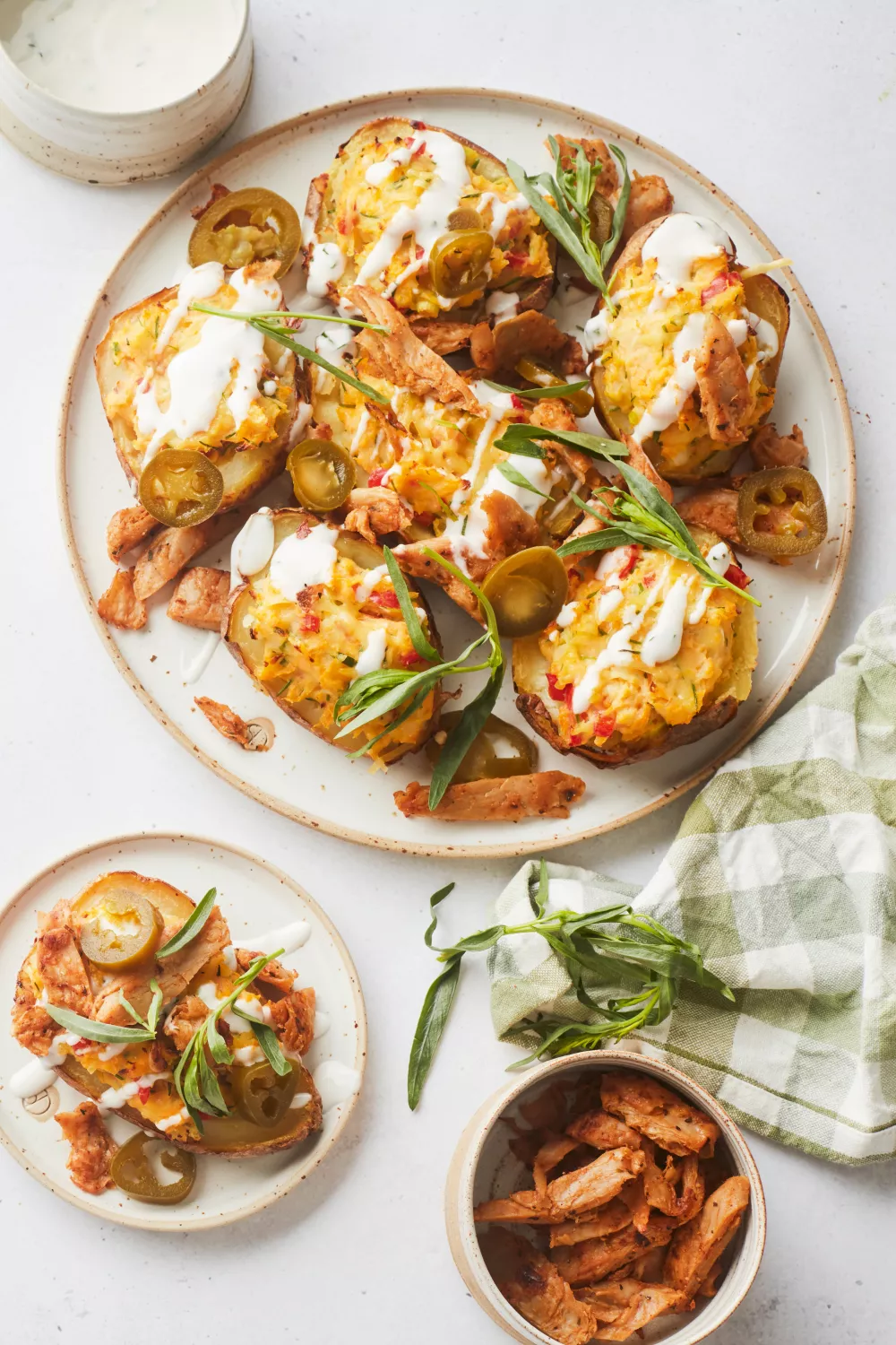Kumpir met vegan kipstukjes is een volle, hartige gevulde aardappel met een knapperige schil en zachte romige vulling van plantaardige yoghurt en geraspte kaas. De kipstukjes worden pittig gekruid met cajunkruiden en krokant gebakken terwijl de oven de aardappels boterzacht maakt, ideaal als comfort food voor een doordeweekse maaltijd, zomerse barbecue of gezellige borrel. Afgewerkt met frisse dille en een romige dressing van vegan mayonaise, citroen en appelciderazijn voor een frisse toets.