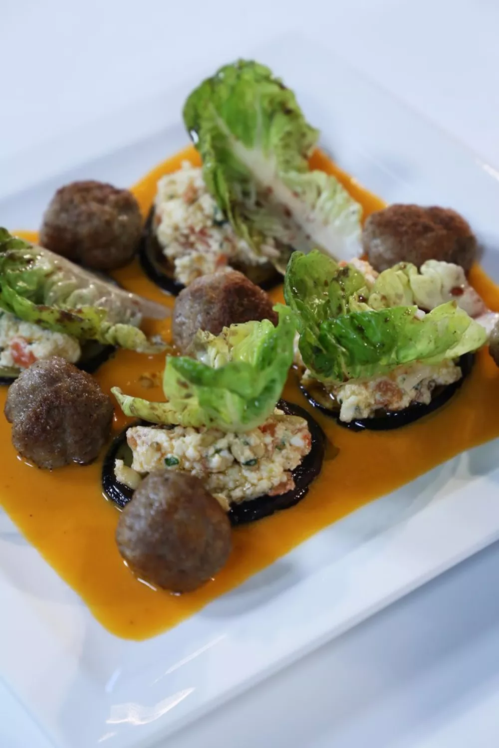 Leg enkele aubergineplakjes en enkele lamsballetjes op een bord. Werk af met enkele lepeltjes saus.