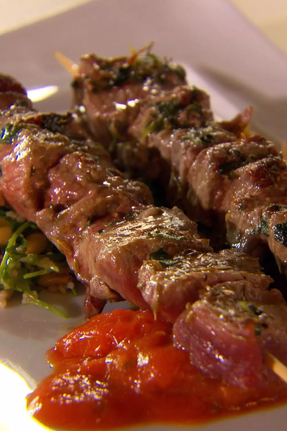 Deze sappige lamskebabspiesjes met kruidige couscoussalade combineren gegrild lam, gemarineerd in komijn en oregano, met een frisse mix van abrikozen, pijnboompitten en munt. Een snelle tomatensaus van passata en halfgedroogde tomaatjes voegt zoete en pittige tonen. Ideaal voor zomerse barbecues of een smaakvolle doordeweekse maaltijd.