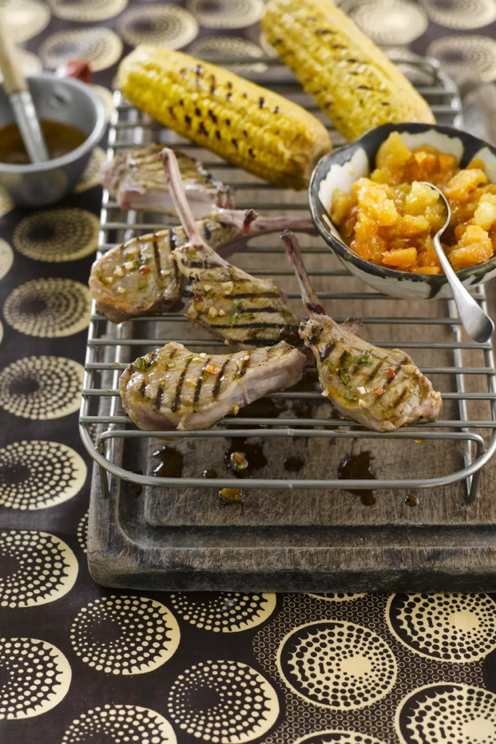 Deze sappige lamskoteletten met een zoet en pikant mango en abrikozenchutney zijn perfect voor een zomerse barbecue of een feestelijk diner. De koteletten marineren in een kruidige mix en worden kort en krachtig op de BBQ gegrild, geserveerd met boterglanzende gegrilde maïskolven. De chutney van pompoen, appel en gedroogde abrikozen geeft warme fruitigheid, aangezuurd met citroen en ciderazijn en afgemaakt met verse koriander.