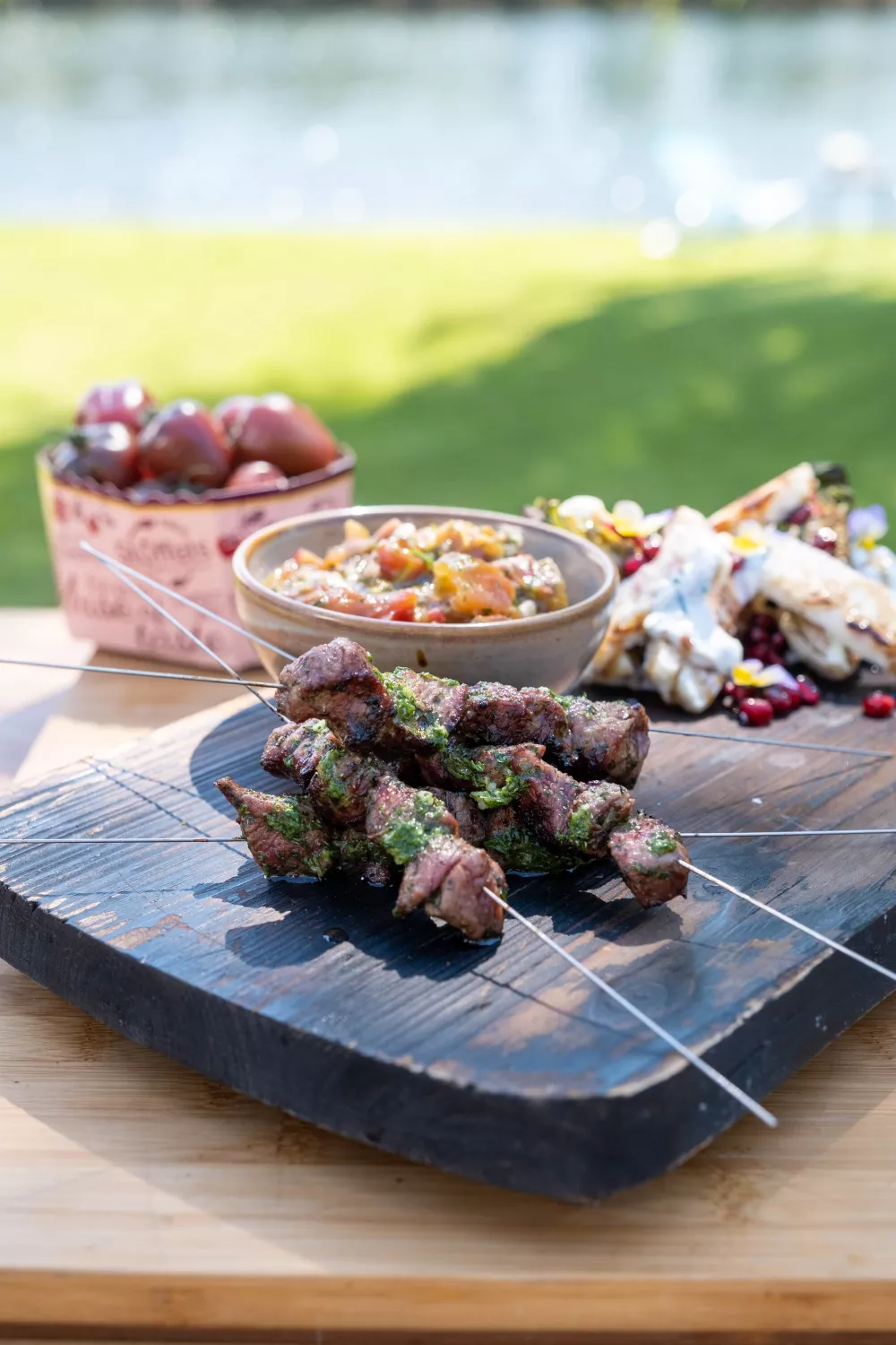 Subtiel en toch uitgesproken, zo kunnen we de smaak van lam samenvatten. Het malse vlees wil graag een zachte en vlezige wijn, dus Grenache is een ideale partner. De salsa van tomaat, kappertjes en het zoute van de ansjovis zoekt molligheid, frisheid en frivoliteit. Hiervoor kan deze Secrets del Priorat rekenen op Carignan. Omdat de spies op de BBQ gaat en zo gegrilde accenten duidelijk present tekenen, brengt de korte houtlagering alles tot een mooi versmolten geheel. Serveer deze wijn fris, maar niet gekoeld op zo’n 17°C.