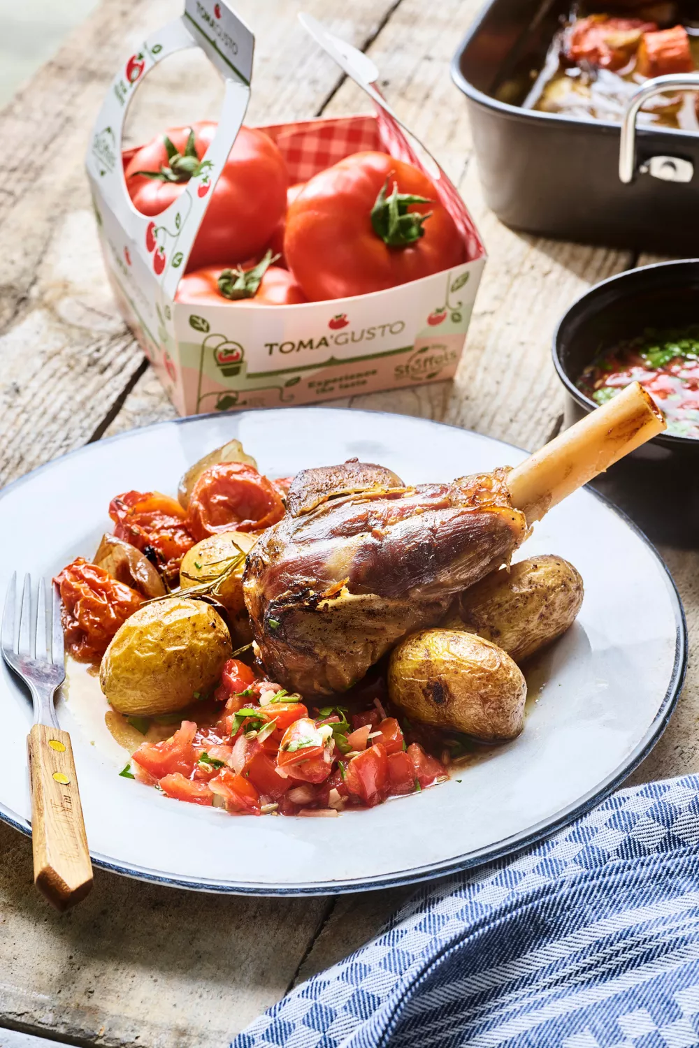 Wanneer het vlees een kerntemperatuur van 75°C heeft en de aardappelen gaar zijn, is het tijd om te serveren. Doe wat groenten en krieltjes op een bord, leg er een lamsschenkel erbij en werk af met de gepekelde tomaatjes.