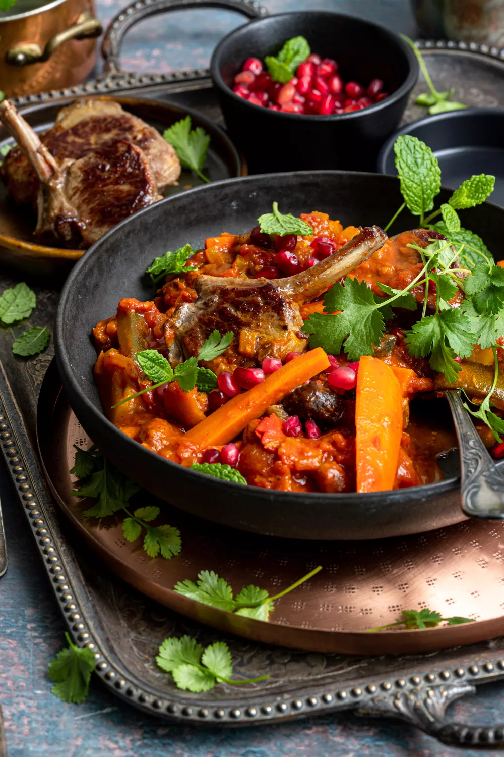 Deze geurige lamstajine met lamsmignonettes combineert warme specerijen zoals ras el hanout en harissapoeder met zoete rozijnen en gedroogde pruimen voor een rijk Marokkaans geïnspireerde stoofgerecht. Het vlees wordt kort aangebraden en vervolgens langzaam gestoofd in een tajine zodat de smaken intenser worden en het vlees boterzacht smelt. Afgewerkt met frisse munt, koriander en granaatappelpitten is dit recept ideaal als winterse familiediner of feestelijk hoofdgerecht bij couscous of brood.