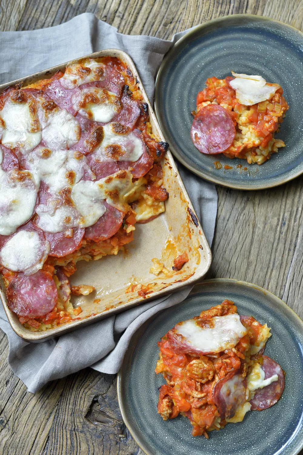 Neem een grote ovenschotel en boter ze in. Leg onderaan een laagje risotto, daarbovenop een laagje ragout, salami en mozzarella. Herhaal dit nog een keer.