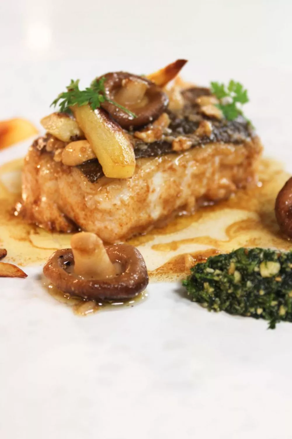 Licht gezouten en kort gebakken lengfilet met hazelnootboter en kerveltapenade, een elegant visgerecht vol subtiele noten en frisse citroenzeste. Krokant van buiten en boterzacht van binnen, geserveerd met gebakken kervelwortelreepjes en shiitakes voor aardse tonen die goed passen bij lente of een feestelijk diner. De bereiding combineert snel pekelen, een beurre noisette met sjalot en hazelnoten en een frisse afwerking met verse kervel.