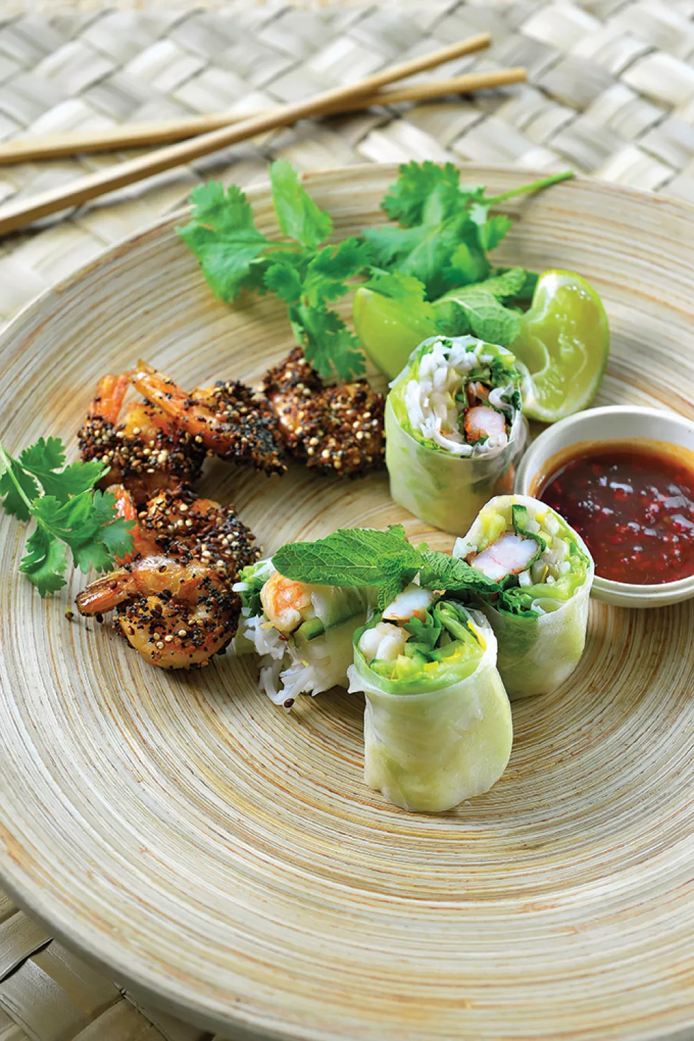 Frisse lenterolletjes met sappige scampi, rijstvermicelli en aromatische koriander en munt brengen de lichte knapperigheid van de Aziatische keuken op tafel. Kort gebakken scampi met citroengras en kurkuma worden opgerold in rijstpapier met komkommer en witloof en geserveerd met een pittige vinaigrette van vissaus, limoen, knoflook en chili. Perfect voor een zomerse lunch, borrel of lentemaaltijd, snel te maken en ideaal om vooraf klaar te zetten.