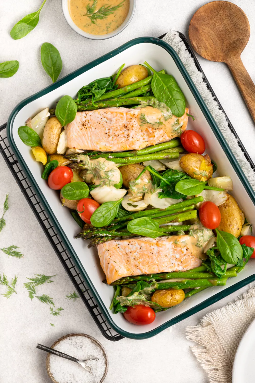 Deze frisse lentetraybake met zalm, krieltjes, venkel en groene asperges combineert knapperig geroosterde groenten met sappige vis en een pittig dillesausje voor een lichte maar vullende maaltijd. De eenvoudige ovenbereiding met kappertjes, kerstomaatjes en een scheutje citroen houdt het snel en smaakvol. Perfect voor een doordeweekse avond of een ontspannen weekendlunch in de lente.