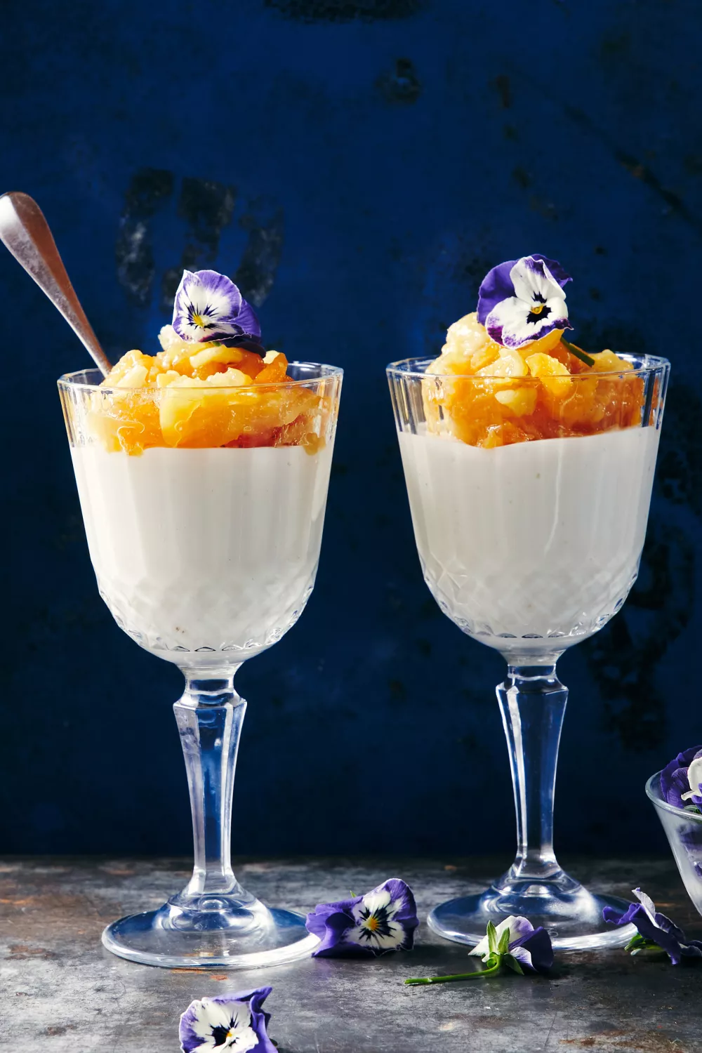 Deze Libanese muhallebi combineert een fluweelzachte melkpudding van maïzena met een warme abrikozen en banaantopping op smaak gebracht met sinaasappel en kardemom. Het romige op het fornuis bereide dessert is licht en fruitig en leent zich uitstekend voor lente en zomer gelegenheden of een feestelijk diner, geserveerd in elegante cocktailglazen. Vervang kardemom door kaneel voor een verrassende variant en werk af met eetbare bloemen.