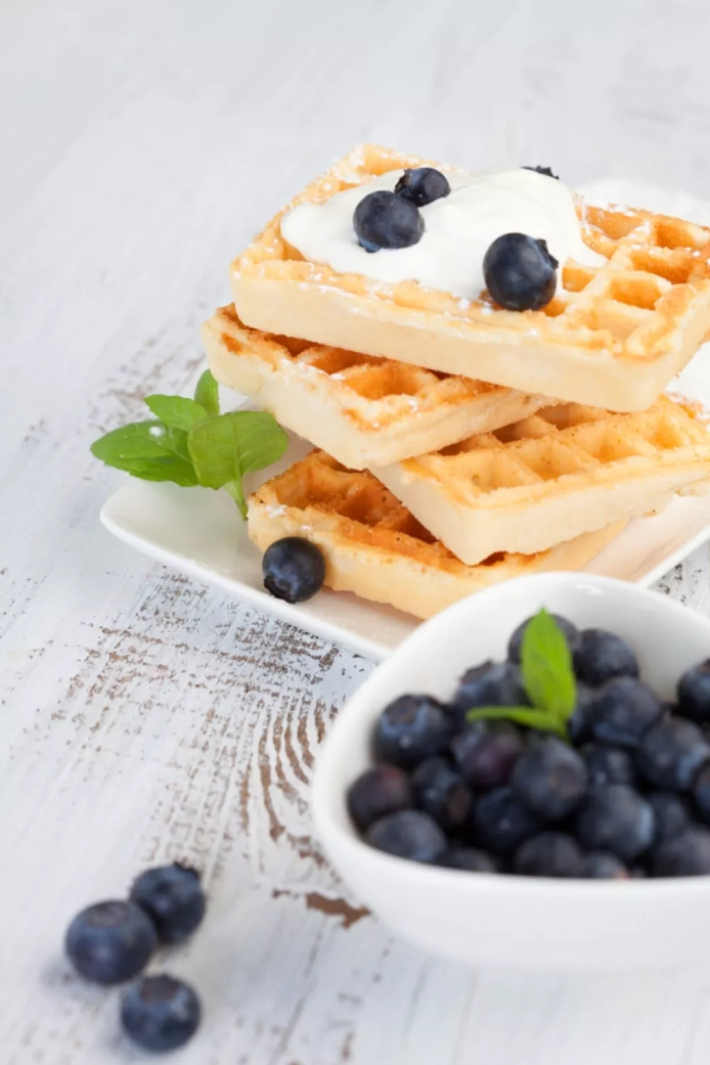 Bak de wafels en serveer samen met poedersuiker en de opgeklopte Alpro Luchtig & Creamy.