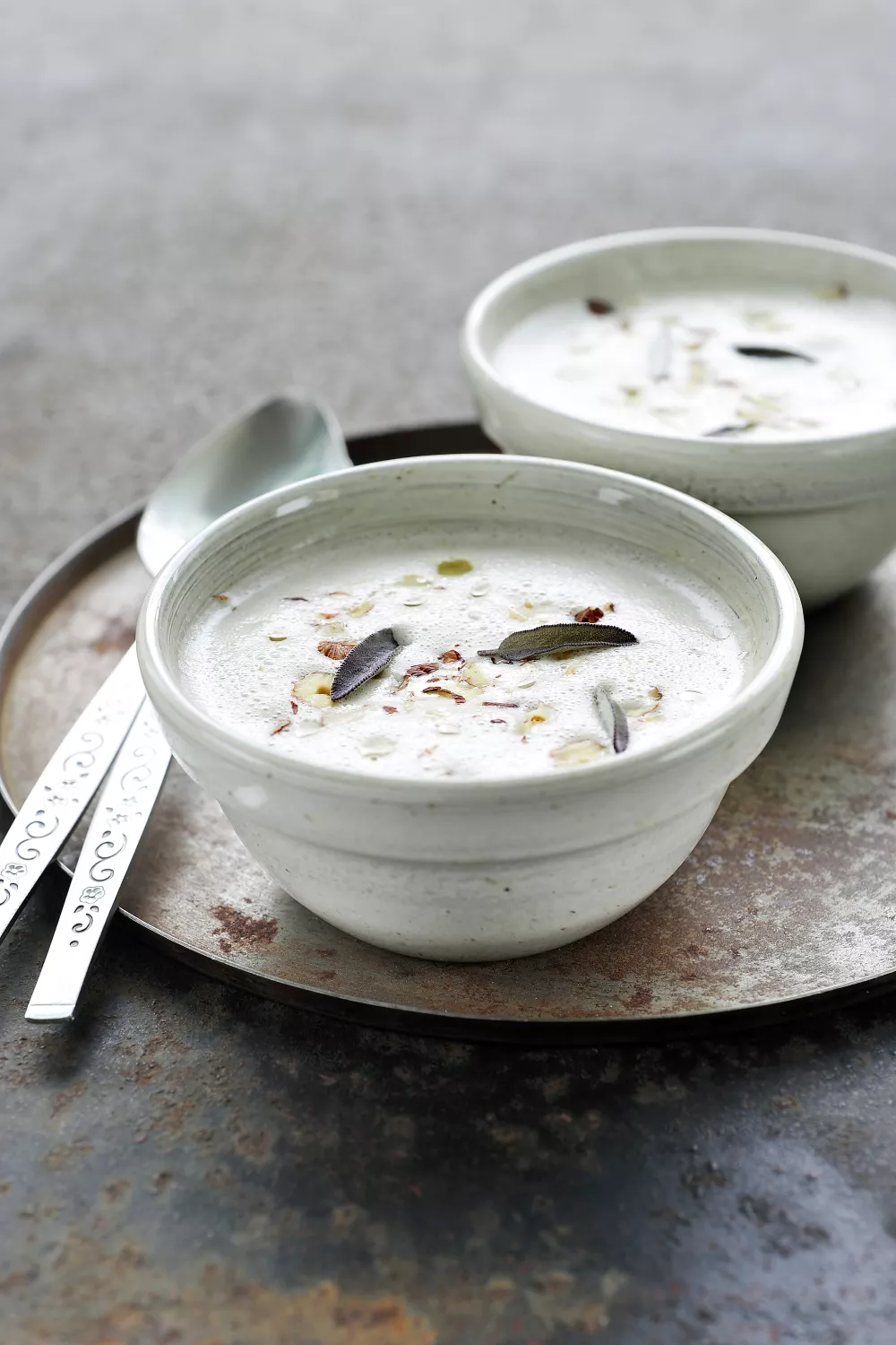 Mix de velouté goed schuimig en verdeel ze over vier voorverwarmde kommen, werk af met enkele fijne blaadjes salie en hazelnoten.