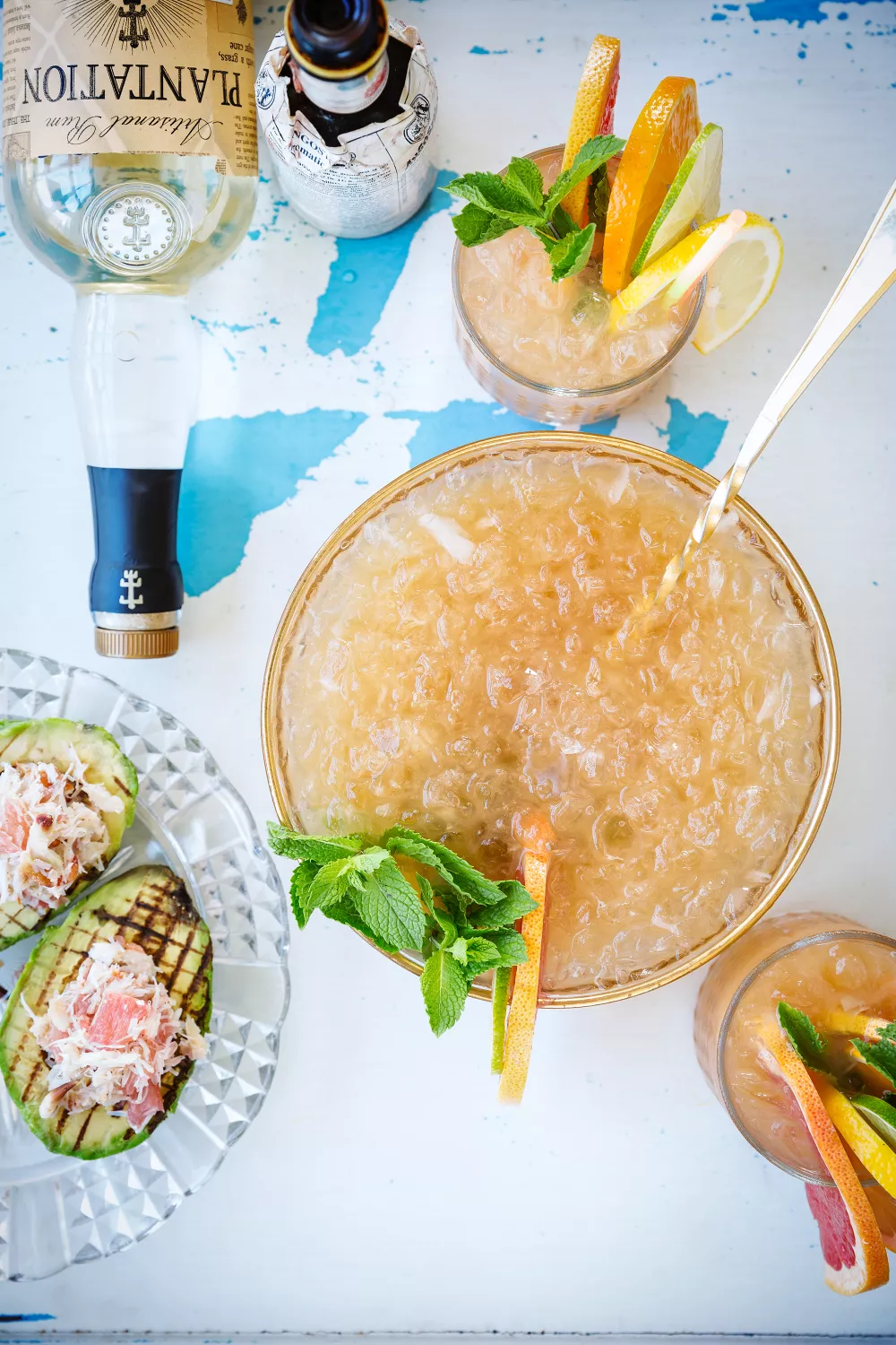 Een zomers, feestelijk voorgerecht dat fris citrus met romige avocado en zacht krabvlees combineert. De gegrilde avocado krijgt karakterijke grillstrepen, het krabmengsel wordt opgefrist met pompelmoes en een scheutje mirin. Daarbij past een zelfgemaakte ruminfusie met citrus en munt als stijlvolle aperitiefcombinatie.