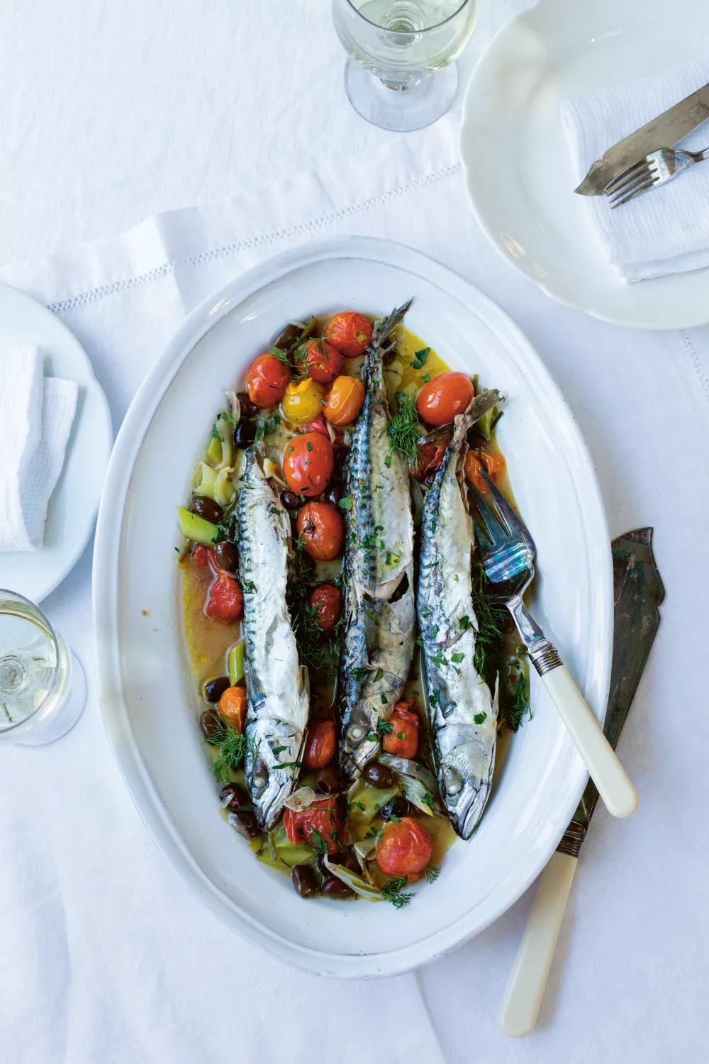 Verhit in een flinke koekenpan een scheut olijfolie en voeg de venkel, lente-ui en de kruidensteeltjes toe. Bak de groenten circa 3 minuten op middelhoog vuur en voeg dan de knoflook, tomaten en olijven toe. Breng op smaak met zout en peper. Bak nog 1 minuut en leg de makrelen erop. Schenk de witte wijn erbij, laat wat inkoken en giet dan het water erbij. Leg de deksel op de pan en laat de makreel in 10 minuten op middelhoog vuur gaar stomen.