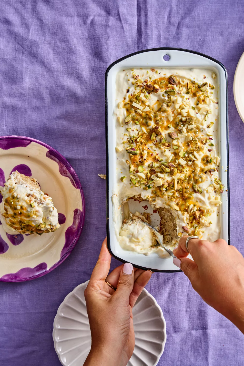 Haal de cake is als deze is afgekoeld uit de vorm en snijd in de lengte doormidden. Verdeel het passievruchtensap met een lepeltje over de twee lagen cake. Dit trekt – net als bij lange vingers – in de cake. Leg de onderkant van de cake terug in de schaal. Verdeel hier de helft van de vulling over. Leg daar de bovenkant van de cake op, en daarover de overige vulling. Top af met de overige passievrucht.