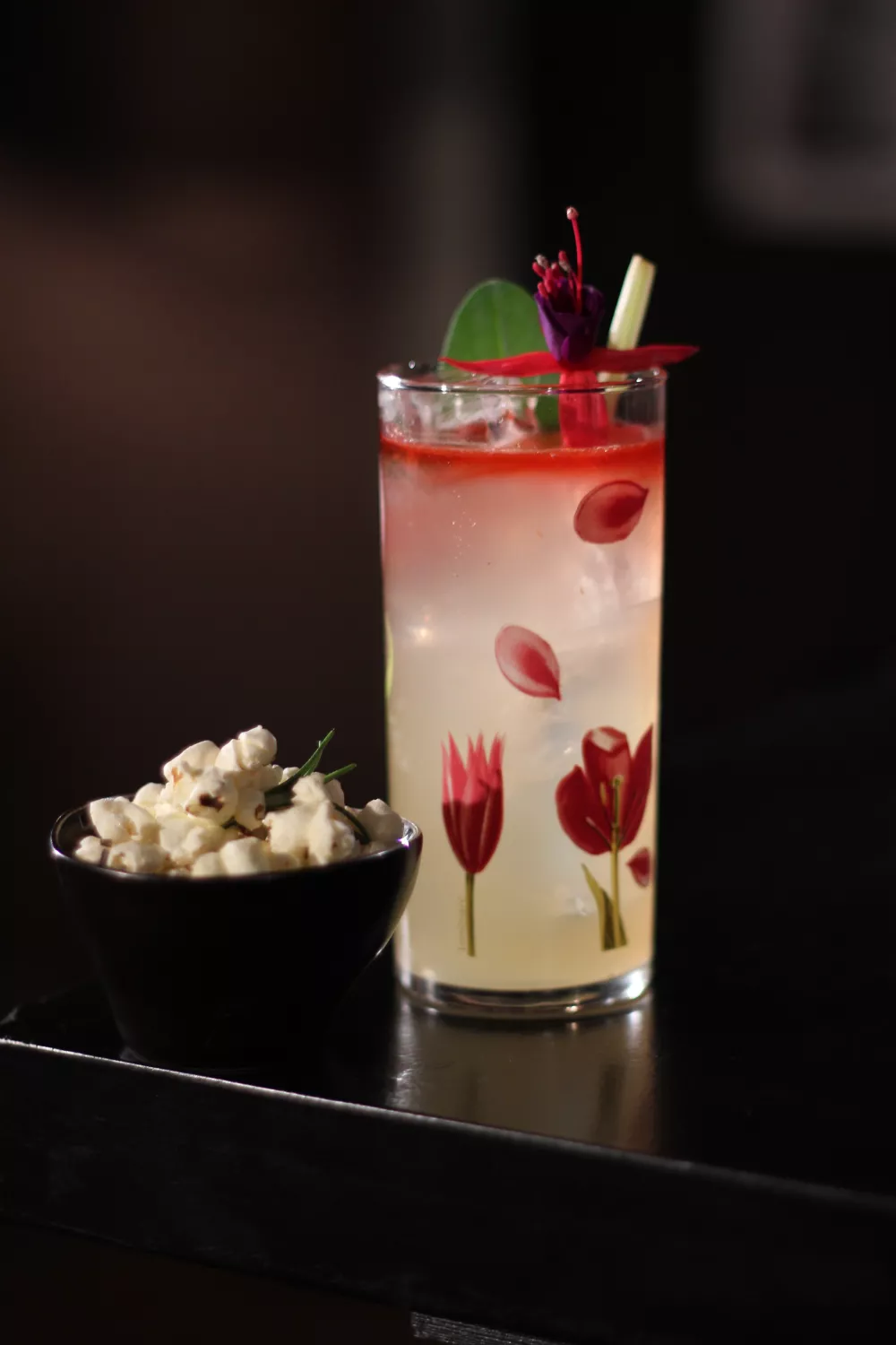 Werk af met een dash peychauds bitters, een oesterblad, een klein stukje citroengras en een eetbaar bloemetje.