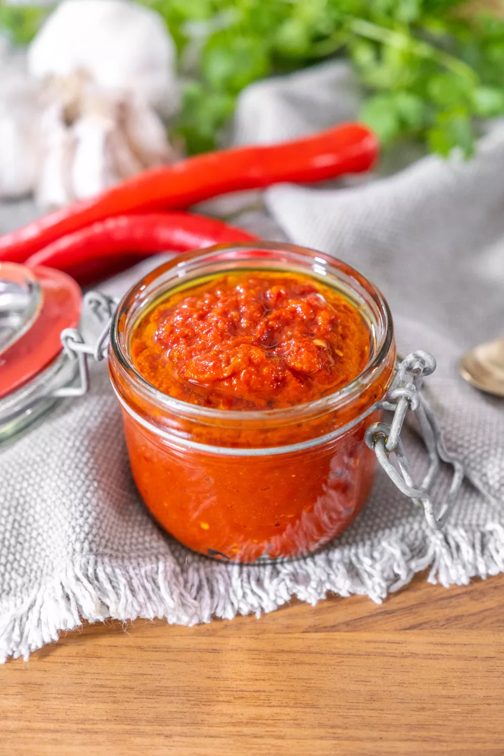 Deze pittige Marokkaanse harissa brengt warmte en diepte met rode chilipepers, knoflook, tomatenpuree en aromatische specerijen zoals komijn, koriander, anijs en gerookt paprikapoeder. In de chopper mix je alles tot een smeuïge pasta die je onder een laagje olijfolie bewaart. Heerlijk als smaakmaker voor gegrild vlees, marinades en stoofschotels, zowel bij zomerbarbecues als bij hartverwarmende wintermaaltijden.