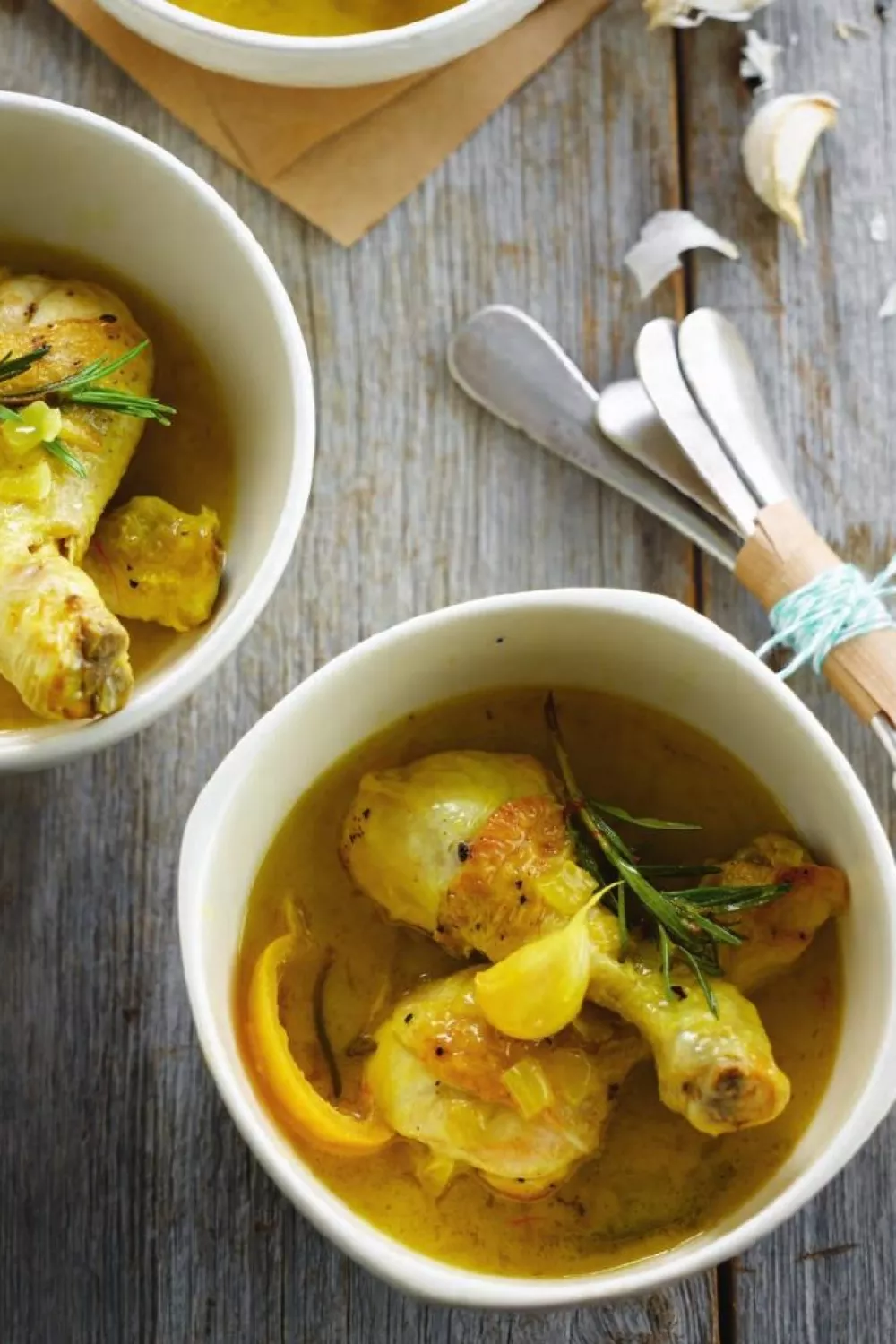 Verhit 1 el citroenolie en 1 el boter in een stoofpot. Voeg er de kippenbouten aan toe en bak ze in 5 minuten aan alle kanten lichtbruin. Haal uit de pot en houd warm.