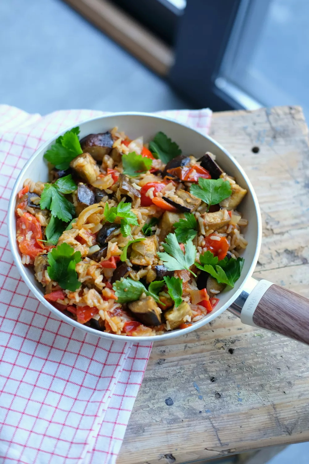 Laat op een zacht vuur sudderen. Laat de tomaten krimpen en de saus wat indikken. Voeg nu de aubergine-blokjes toe. Voeg de zilvervliesrijst bij het geheel. Snijd de peterselie fijn en voeg toe.