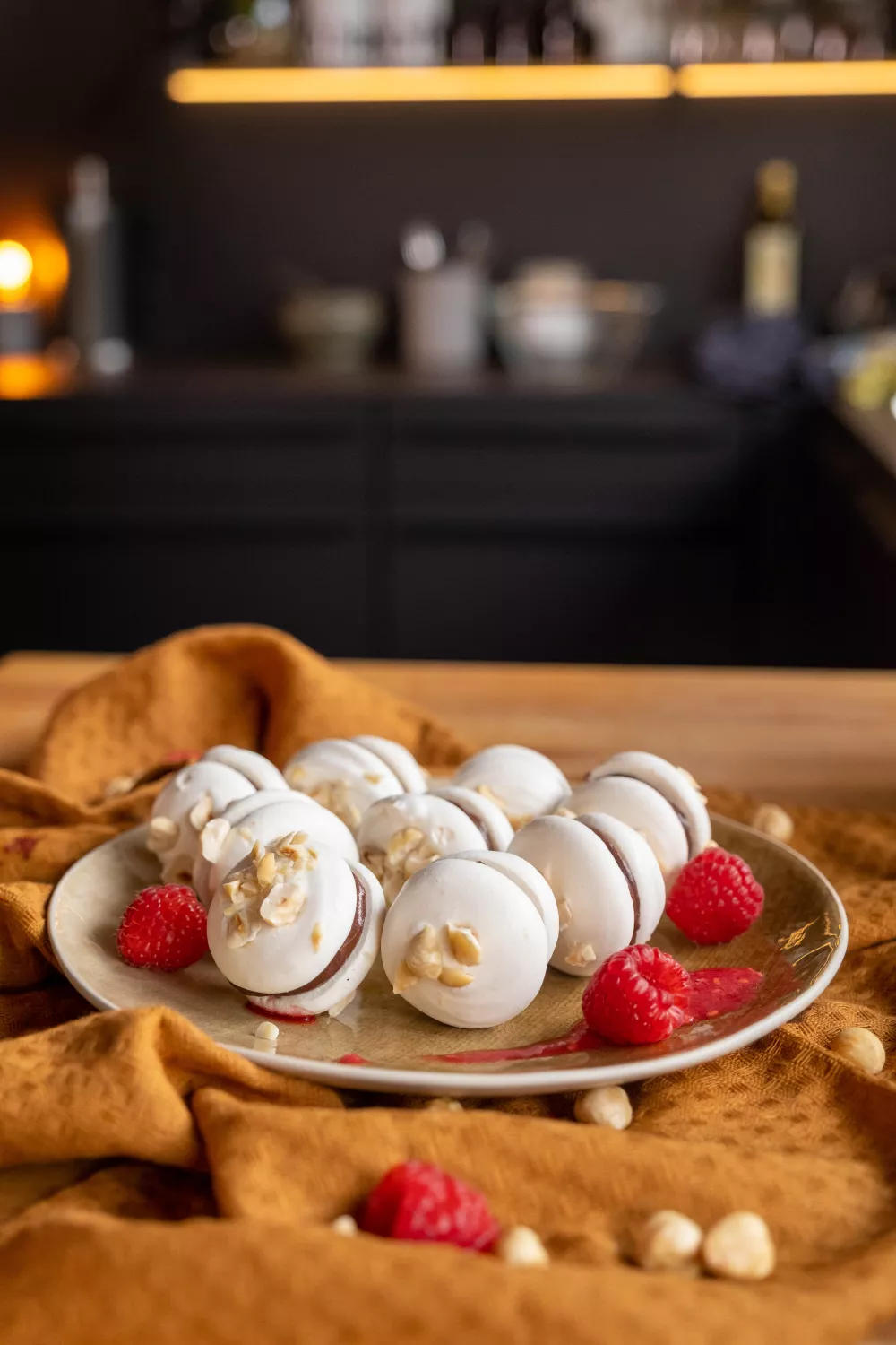 Luchtige meringuetofjes met een fris frambozencoulis en romige chocoladebotercrème vormen een speels en feestelijk dessert. De eiwitten worden stijfgeklopt, met een spuitzak opgespoten en langzaam gedroogd in de oven op lage temperatuur; fijngehakte hazelnoten geven extra bite. Perfect bij koffie of thee, voor een zomerse picknick of als elegant afsluiter van een diner.