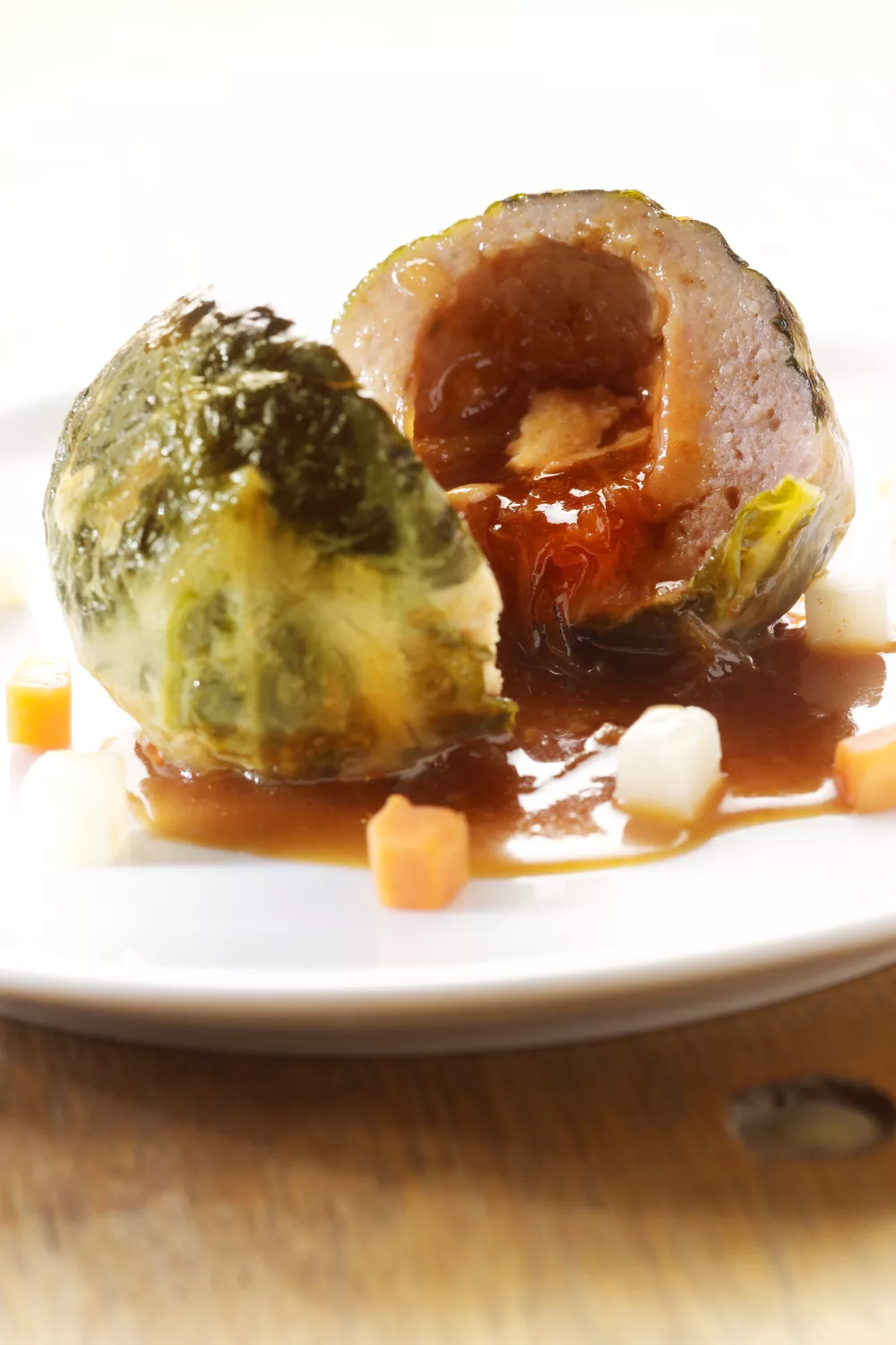 Meng het gehakt met de eieren, paneermeel en een scheutje melk. Voeg zoveel paneermeel toe tot het gehakt niet meer aan de handen kleeft. Kruid met peper, zout en wat nootmuskaat. Neem een blokje diepgevroren uiensaus en rol er wat gehakt omheen tot je een mooie bol krijgt. Rol er een koolblad omheen en daarna een stukje crepinette. Rol deze bol even door de met peper en zout gekruide bloem. Verwarm de oven voor op 170 °C. Verhit boter in een pan. Leg er de bollen in zonder dat ze elkaar raken en kleur ze aan alle kanten aan. Bevochtig met de rest van de fond. Zet een deksel op de pan en laat 20 minuten garen in de warme oven. Haal de gare bollen uit de pan. Laat ze even rusten op een plateau. Laat de jus inkoken tot een licht gebonden saus. Werk af met peper en zout. Giet de jus door een zeef. Snijd de knolselder en wortel in blokjes. Kook ze even tot ze beetgaar zijn. Voeg ze toe aan de ingekookte jus.